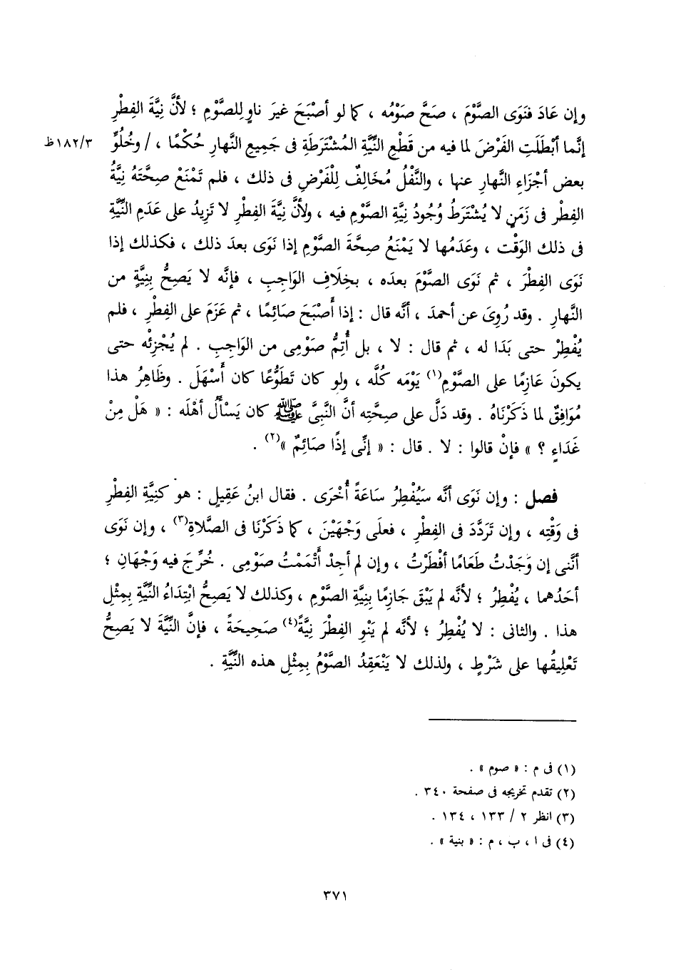 فصل: وإن نَوَى أنَّه سَيُفْطِرُ سَاعَةً أُخْرَى. فقال ابنُ عَقِيلٍ: هو كنِيَّةِ الفِطْرِ فى وَقْتِه، وإن تَرَدَّدَ فى الفِطْرِ، فعلَى وَجْهَيْن، كما ذَكَرْنَا فى الصَّلاةِ (٣)، وإن نَوَى أنَّنى إن وَجَدْتُ طَعَامًا أفْطَرْتُ، وإن لم أجِدْ أَتْمَمْتُ صَوْمِى. خُرِّجَ فيه وَجْهَانِ؛ أحَدُهما، يُفْطِرُ؛ لأنَّه لم يَبْقَ جَازِمًا بِنِيَّةِ الصَّوْمِ، وكذلك لا يَصِحُّ ابْتِدَاءُ النِّيَّةِ بِمِثْلِ هذا. والثانى: لا يُفْطِرُ؛ لأنَّه لم يَنْوِ الفِطْرَ نِيَّةً (٤) صَحِيحَةً، فإنَّ النِّيَّةَ لا يَصِحُّ تَعْلِيقُها على شَرْطٍ، ولذلك لا يَنْعَقِدُ الصَّوْمُ بِمِثْلِ هذه النِّيَّةِ.