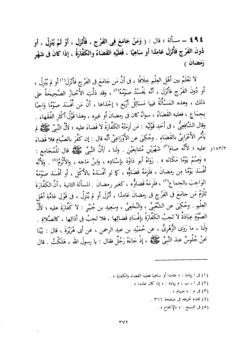 لا نَعْلَمُ بين أهْلِ العِلْمِ خِلَافًا، فى أنَّ مَن جَامَعَ فى الفَرْجِ فأنْزَلَ (١) أو لم يُنْزِلْ، أو دُونَ الفَرْجِ فأنْزَلَ، أنَّه يَفْسُدُ صَوْمُهُ (٢)، وقد دَلَّتِ الأخْبارُ الصَّحِيحَةُ على ذلك، وهذه المَسْأَلَةُ فيها مَسَائِلُ أرْبَع؛ إحْدَاها، أن مَن أفْسَدَ صَوْمًا وَاجِبًا بِجِمَاعٍ، فعليه القَضَاءُ، سواءٌ كان فى رمضانَ أو غيرِه، وهذا قَوْلُ أكْثَرِ الفُقَهاء. وقال الشَّافِعِىُّ، فى أحَدِ قَوْلَيْه: مَن لَزِمَتْهُ الكَفَّارَةُ لا قَضاءَ عليه؛ لأنَّ النَّبِىَّ -صَلَّى اللهُ عَلَيْهِ وَسَلَّمَ- لم يَأْمُر الأعْرَابِىَّ بالقَضَاءِ. وحُكِىَ عن الأوْزَاعِىِّ أنَّه قال: إن كَفَّرَ بالصِّيامِ فلا قَضاءَ عليه؛ لأنَّه صامَ (٣) شَهْرَيْنِ مُتَتابِعَيْنِ. ولَنا، أن النَّبِىَّ -صَلَّى اللهُ عَلَيْهِ وَسَلَّمَ- قال للْمُجَامِعِ: "وَصُمْ يَوْمًا مَكَانَه". رَوَاهُ أبو دَاوُدَ بإسْنَادِه، وابنُ مَاجه، والأثْرَمُ (٤). ولأنَّه أفْسَدَ يَوْمًا مِن رمضانَ، فلَزِمَهُ قَضَاؤُه، كما لو أفْسَدَهُ بالأكْلِ، أو أفْسَدَ صَوْمَهُ الوَاجِبَ بالجِماعِ (٥)، فلَزِمَهُ قَضاؤُه، كغيرِ رمضانَ. المسألة الثانية، أن الكَفَّارَةَ تَلْزَمُ مَن جامَعَ فى الفَرْجِ فى رمضانَ عَامِدًا، أنْزَلَ أو لم يُنْزِلْ، فى قَوْلِ عَامَّةِ أهْلِ العِلْمِ. وحُكِىَ عن الشَّعْبِىِّ، والنَّخَعِىِّ، وسَعِيدِ بن جُبَيْرٍ: لا كَفَّارَةَ عليه؛ لأنَّ الصَّوْمَ عِبَادَةٌ لا تَجِبُ الكَفَّارَةُ بإفْسَادِ قَضائِها، فلا تَجِبُ فى أدَائِها، كالصَّلاةِ. ولَنا، ما رَوَى الزُّهْرِىُّ، عن حُمَيْدِ بن عبدِ الرحمنِ، عن أبى هُرَيْرَةَ، قال: بَيْنَا نحنُ جُلُوسٌ عندَ النَّبِىِّ -صَلَّى اللهُ عَلَيْهِ وَسَلَّمَ-، إذْ جَاءَهُ رَجُلٌ فقال: يا رسولَ اللَّه، هَلَكْتُ. قال