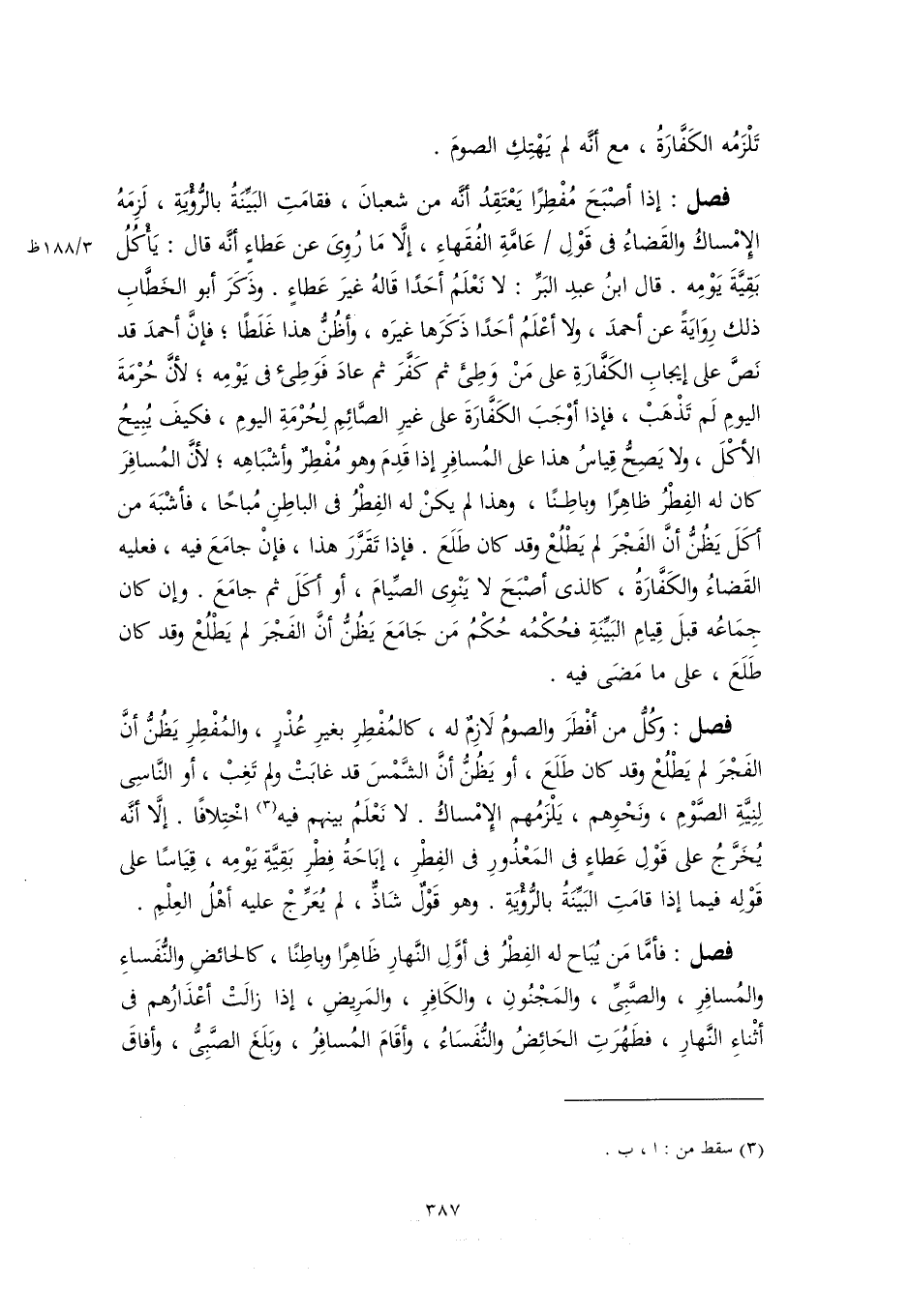 فصل: وكُلُّ من أفْطَرَ والصومُ لَازِمٌ له، كالمُفْطِرِ بغيرِ عُذْرٍ، والمُفْطِرِ يَظُنُّ أنَّ الفَجْرَ لم يَطْلُعْ وقد كان طَلَعَ، أو يَظُنُّ أنَّ الشَّمْسَ قد غابَتْ ولم تَغِبْ، أو النَّاسِى لِنِيَّةِ الصَّوْمِ، وَنحْوِهم، يَلْزَمُهم الإمْساكُ. لا نَعْلَمُ بينهم فيه (٣) اخْتِلافًا. إلَّا أنَّه يُخَرَّجُ على قَوْلِ عَطاءٍ فى المَعْذُورِ فى الفِطْرِ، إبَاحَةُ فِطْرِ بَقِيَّةِ يَوْمِه، قِيَاسًا على قَوْلِه فيما إذا قامَتِ البَيِّنَةُ بالرُّؤْيَةِ. وهو قَوْلٌ شَاذٌّ، لم يُعَرِّجْ عليه أهْلُ العِلْمِ.
