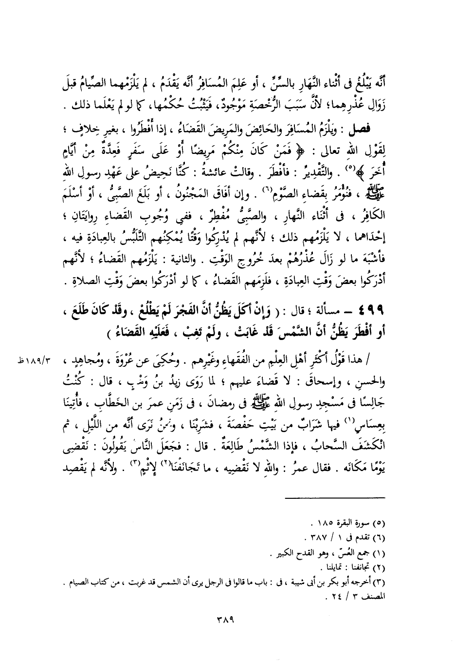 فصل: ويلْزَمُ المُسَافِرَ والحَائِضَ والمَرِيضَ القَضَاءُ، إذا أفْطرُوا، بغيرِ خِلافٍ؛ لِقَوْلِ اللهِ تعالى: {فَمَنْ كَانَ مِنْكُمْ مَرِيضًا أَوْ عَلَى سَفَرٍ فَعِدَّةٌ مِنْ أَيَّامٍ أُخَرَ} (٥). والتَّقْدِيرُ: فأفْطَرَ. وقالتْ عائشةُ: كُنَّا نَحِيضُ على عَهْدِ رسولِ اللهِ -صَلَّى اللهُ عَلَيْهِ وَسَلَّمَ-، فنُؤْمَرُ بِقَضاءِ الصَّوْمِ (٦). وإن أفَاقَ المَجْنُونُ، أو بَلَغَ الصَّبِىُّ، أوْ أسْلَمَ الكَافِرُ، فى أثْنَاء النَّهارِ، والصَّبِىُّ مُفْطِرٌ، ففى وُجُوبِ القَضاءِ رِوايَتَانِ؛ إحْدَاهما، لا يَلْزَمُهم ذلك؛ لأنَّهم لم يُدْرِكُوا وَقْتًا يُمْكِنُهم التَّلبُّسُ بالعِبادَةِ فيه، فأشْبَهَ ما لو زَالَ عُذْرُهُمْ بعدَ خُرُوجِ الوَقْتِ. والثانية: يَلْزَمُهم القَضاءُ؛ لأنَّهم أدْرَكُوا بعضَ وَقْتِ العِبادَةِ، فلَزِمَهم القَضاءُ، كما لو أدْرَكُوا بعضَ وَقْتِ الصلاةِ.