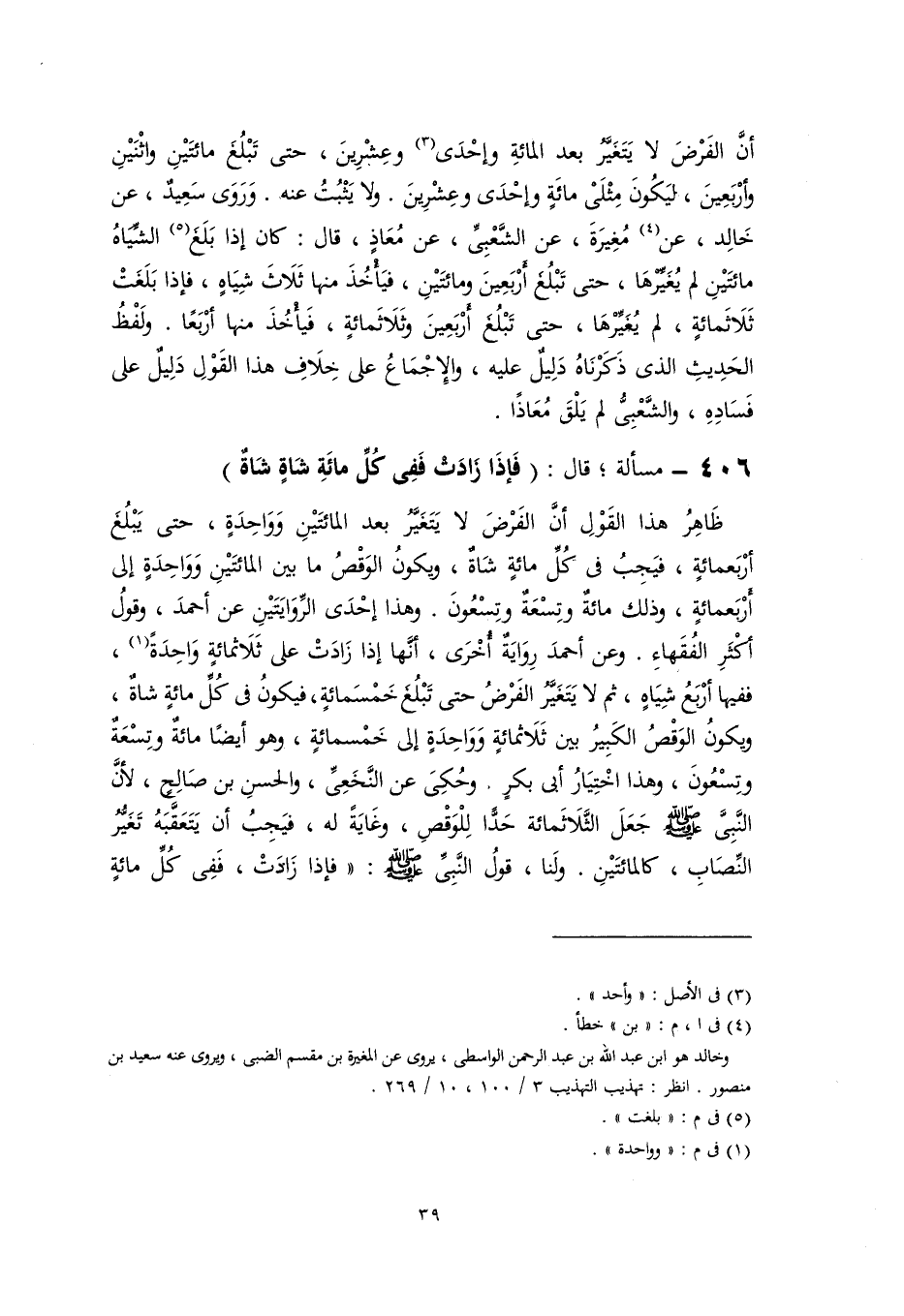 أنَّ الفَرْضَ لا يَتَغَيَّرُ بعد المائةِ وإحْدَى (٣) وعِشْرِينَ، حتى تَبْلُغَ مائتَيْنِ واثْنَيْنِ وأرْبَعِينَ، ليَكُونَ مِثْلَىْ مائَةٍ وإحْدَى وعِشْرِينَ. ولا يَثْبُتُ عنه. وَرَوَى سَعِيدٌ، عن خَالِد، عن (٤) مُغِيرَةَ، عن الشَّعْبِىِّ، عن مُعَاذٍ، قال: كان إذا بَلَغَ (٥) الشِّيَاهُ مائتَيْنِ لم يُغَيِّرْهَا، حتى تَبْلُغَ أَرْبَعِينَ ومائتَيْنِ، فيَأْخُذَ منها ثَلَاثَ شِيَاهٍ، فإذا بَلَغَتْ ثَلَاثَمائةٍ، لم يُغَيِّرْهَا، حتى تَبْلُغ أرْبَعِينَ وثَلَاثَمائةٍ، فَيأخُذَ منها أرْبَعًا. ولَفْظُ الحَدِيثِ الذى ذَكَرْنَاهُ دَلِيلٌ عليه، والإجْمَاعُ على خِلَافِ هذا القَوْلِ دَلِيلٌ على فَسَادِهِ، والشَّعْبِىُّ لم يَلْقَ مُعَاذًا.