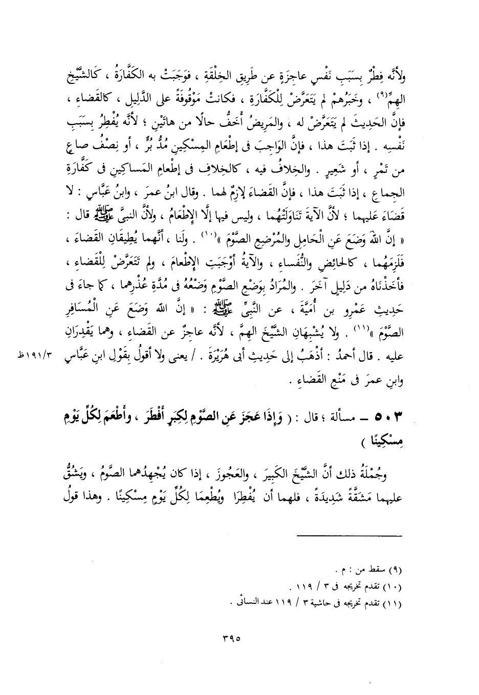ولأنَّه فِطْرٌ بِسَبَبِ نَفْسٍ عاجِزَةٍ عن طَرِيقِ الخِلْقَةِ، فوَجَبَتْ به الكَفَّارَةُ، كَالشَّيْخِ الهِمِّ (٩)، وخَبَرُهمْ لم يَتَعَرَّضْ لِلْكَفَّارَةِ، فكانتْ مَوْقُوفَةً على الدَّلِيلِ، كالقَضاءِ، فإنَّ الحَدِيثَ لم يَتَعَرَّضْ له، والمَرِيضُ أخَفُّ حالًا من هاتَيْنِ؛ لأنَّه يُفْطِرُ بِسَبَبِ نَفْسِه. إذا ثَبَتَ هذا، فإنَّ الوَاجِبَ في إطْعَامِ المِسْكِينِ مُدُّ بُرٍّ، أو نِصْفُ صاعٍ من تَمْرٍ، أو شَعِيرٍ. والخِلافُ فيه، كالخِلافِ في إطْعامِ المَساكِينِ في كَفَّارَةِ الجِماعِ، إذا ثَبَتَ هذا، فإنَّ القَضاءَ لازِمٌ لهما. وقال ابنُ عمرَ، وابنُ عَبَّاسٍ: لا قَضَاءَ عَليهما؛ لأنَّ الآيةَ تَنَاوَلَتْهُما، وليس فيها إلَّا الإِطْعَامُ، ولأنَّ النبيَّ -صَلَّى اللهُ عَلَيْهِ وَسَلَّمَ- قال: "إنَّ اللهَ وَضَعَ عَنِ الْحَامِلِ والمُرْضِعِ الصَّوْمَ" (١٠). ولَنا، أنَّهما يُطِيقَانِ القَضاءَ، فَلَزِمَهُما، كالحائِضِ والنُّفَساءِ، والآيةُ أوْجَبَتِ الإطْعامَ، ولم تَتَعَرَّضْ لِلْقَضاءِ، فأخَذْنَاهُ من دَلِيلٍ آخَرَ. والمُرَادُ بِوَضْعِ الصَّوْمِ وَضْعُهُ في مُدَّةِ عُذْرِهما، كما جاءَ في حَدِيثِ عَمْرِو بن أُمَيَّةَ، عن النَّبِىِّ -صَلَّى اللهُ عَلَيْهِ وَسَلَّمَ-: "إنَّ اللَّه وَضَعَ عَنِ الْمُسَافِرِ الصَّوْمَ" (١١). ولا يُشْبِهَانِ الشَّيْخَ الهِمَّ، لأنَّه عاجِزٌ عن القَضاءِ، وهما يَقْدِرَانِ عليه. قال أحمدُ: أذْهَبُ إلى حَدِيثِ أبى هُرَيْرَةَ. يعنى ولا أقولُ بِقَوْلِ ابنِ عَبَّاسٍ وابنِ عمرَ في مَنْعِ القَضاءِ.