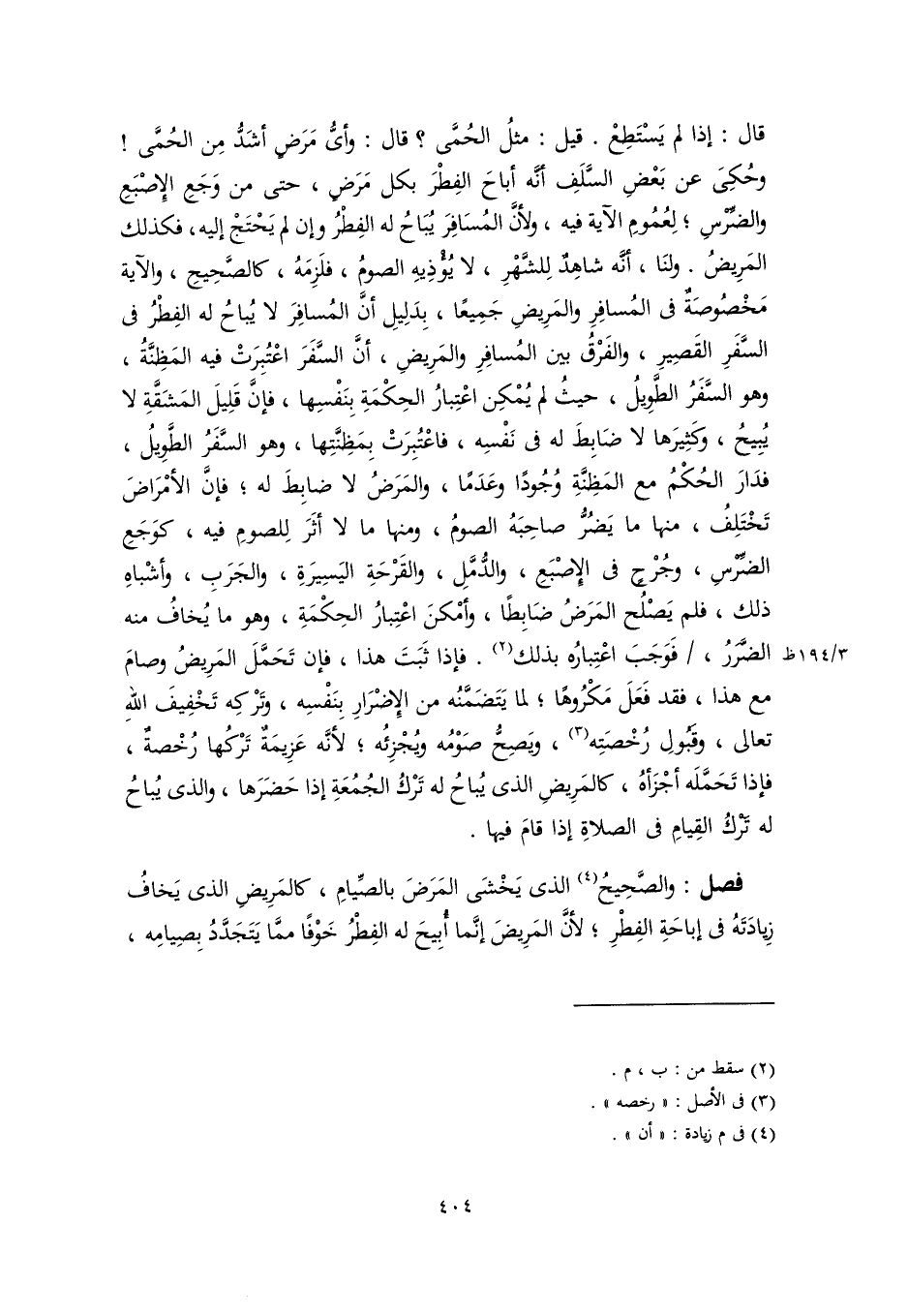 فصل: والصَّحِيحُ (٤) الذى يَخْشَى المَرَضَ بالصِّيامِ، كالمَرِيضِ الذى يَخافُ زِيَادَتَهُ في إباحَةِ الفِطْرُ؛ لأنَّ المَرِيضَ إنَّما أُبِيحَ له الفِطْرُ خَوْفًا ممَّا يَتَجَدَّدُ بِصِيامِه،