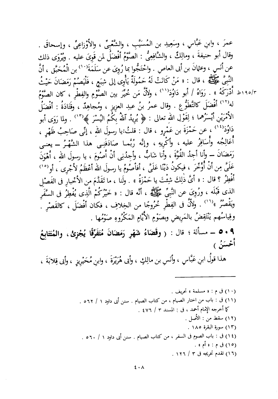 عمرَ، وابنِ عَبَّاسٍ، وسَعِيدِ بن المُسَيَّبِ، والشَّعْبِيِّ، والأوْزاعِيِّ، وإسحاقَ. وقال أبو حنيفةَ، ومالِكٌ، والشَّافِعِيُّ: الصَّوْمُ أفْضَلُ لمن قَوِىَ عليه. ويُرْوَى ذلك عن أنَسٍ، وعثمانَ بن أبى العاصِ. واحْتَجُّوا بما رُوِىَ عن سَلَمَةَ (١٠) بن الْمُحَبَّق، أنَّ النَّبِيَّ -صَلَّى اللهُ عَلَيْهِ وَسَلَّمَ-، قال: "مَنْ كَانَتْ لَهُ حَمُولَةٌ يَأْوِى إلى شِبَعٍ، فَلْيَصُمْ رَمَضَانَ حَيْثُ أدْرَكَهُ". رَوَاهُ أبو دَاوُدَ (١١)، ولأنَّ مَن خُيِّرَ بين الصَّوْمِ والفِطْرِ، كان الصَّوْمُ له (١٢) أفْضَلَ كالتَّطَوُّعِ. وقال عمرُ بنُ عبدِ العزِيزِ، ومُجاهِدٌ، وقَتَادَةُ: أفْضَلُ الأمْرَيْنِ أيْسَرُهما؛ لِقَوْلِ اللهِ تعالى: {يُرِيدُ اللَّهُ بِكُمُ الْيُسْرَ} (١٣). ولما رَوَى أبو دَاوُدَ (١٤)، عن حَمْزَةَ بن عَمْرٍو، قال: قلتُ: يا رسولَ اللهِ، إنِّي صَاحِبُ ظَهْرٍ، أُعَالِجُه وأُسَافِرُ عليه، وأكْرِيهِ، وإنَّه رُبَّما صَادَفَنِي هذا الشَّهْرُ -يعنى رَمَضَانَ- وأنا أجِدُ القُوَّةَ، وأنا شَابٌّ، وأجِدُنِي أنْ أَصُومَ، يا رسولَ اللهِ، أَهْوَنَ عَلَيَّ مِن أنْ أُؤَخِّرَ، فيكونُ دَيْنًا عَلَيَّ، أفأصُومُ يا رسولَ اللَّه أعْظَمُ لأجْرِى، أو (١٥) أفْطِرُ؟ قال: "أيَّ ذلِكَ شِئْتَ يا حَمْزَةُ". ولَنا، ما تَقَدَّمَ من الأخْبارِ في الفَصْلِ الذى قَبْلَه، ورُوِىَ عن النَّبِيِّ -صَلَّى اللهُ عَلَيْهِ وَسَلَّمَ-، أنَّه قال: "خَيْرُكُمْ الَّذِى يُفْطِرُ في السَّفَرِ ويَقْصُرُ" (١٦). ولأنَّ في الفِطْرِ خُرُوجًا من الخِلافِ، فكان أفْضَلَ، كالقَصْرِ. وقِياسُهم يَنْتَقِضُ بالمَرِيضِ وبصَوْمِ الأيَّامِ المَكْرُوهِ صَوْمُها.