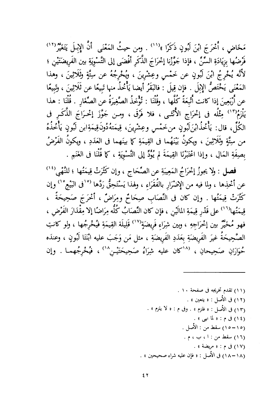 مَخَاضٍ، أخْرَجَ ابْنَ لَبُونٍ ذَكَرًا" (١١). ومن حيثُ المَعْنَى أنَّ الإِبِلَ يَتَغَيَّرُ (١٢) فَرْضُها بِزِيَادَةِ السِّنِّ، فإذا جَوَّزْنا إخْرَاجَ الذَّكَرِ أفْضَى إلى التَّسْوِيَةِ بين الفَرِيضَتَيْنِ، لأنَّه يُخْرِجُ ابْنَ لَبُونٍ عن خَمْسٍ وعِشْرِينَ، ويُخْرِجُهُ عن سِتَّةٍ وثَلَاثِينَ، وهذا المَعْنَى يَخْتَصُّ الإِبِلَ. فإن قِيلَ: فالبَقَرُ أيضا يَأْخُذُ منها تَبِيعًا عن ثَلَاثِينَ، وتَبِيعًا عن أرْبَعِينَ إذا كانت أتْبِعَةً كُلَّها، وقُلْنَا: تُؤْخَذُ الصَّغِيرَةُ عن الصِّغَارِ. قُلْنَا: هذا يَلْزَمُ (١٣) مِثْلُه فى إخْرَاجِ الأُنْثَى، فلا فَرْقَ، ومن جَوَّزَ إخْرَاجَ الذَّكَرِ فى الكُلِّ، قال: يَأْخُذُ ابْنَ لَبُونٍ من خَمْسٍ وعِشْرِينَ، قِيمَتهُ دُونَ قِيمَةِ ابن لَبُونٍ يَأْخُذُهُ من سِتَّةٍ وثَلَاثِينَ، ويكونُ بَيْنَهُما فى القِيمَةِ كما بينَهما فى العَدَدِ، ويكونُ الفَرْضُ بِصِفَةِ المَالِ، وإذا اعْتَبَرْنَا القِيمَةَ لم يُؤَدِّ إلى التَّسْوِيَةِ، كما قُلْنَا فى الغَنَمِ.