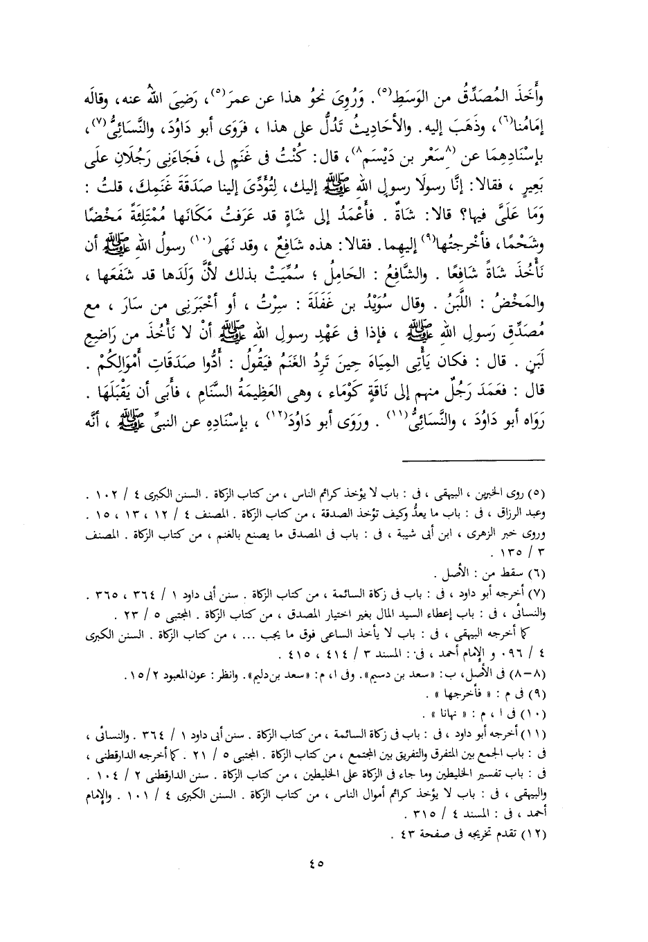 (٥) روى الخبربن، البيهقى، فى: باب لا يؤخذ كرائم الناس، من كتاب الزكاة. السنن الكبرى ٤/ ١٠٢. وعبد الرزاق، فى: باب ما يعدُّ كيف تؤخذ الصدقة، من كتاب الزكاة. المصنف ٤/ ١٢، ١٣، ١٥. وروى خبر الزهرى، ابن أبى شيبة، فى: باب فى المصدق ما يصنع بالغنم، من كتاب الزكاة. المصنف ٣/ ١٣٥.