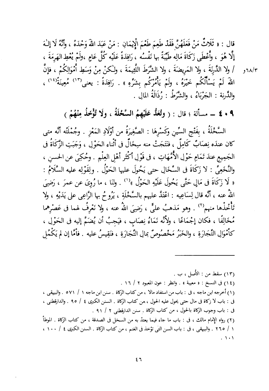 (٢) رواه الإمام مالك، فى: باب ما جاء فيما يعتدّ به من السخل فى الصدقة، من كتاب الزكاة. الموطأ ١/ ٢٦٥. والبيهقى، فى: باب السن التى تؤخذ فى الغنم، من كتاب الزكاة. السنن الكبرى ٤/ ١٠٠، ١٠١.