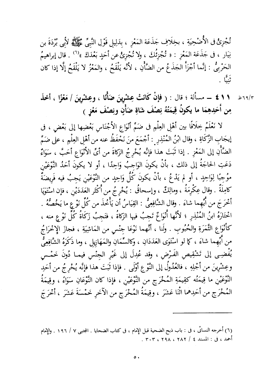 لا نَعْلَمُ خِلَافًا بين أهْلِ العِلْمِ فى ضَمِّ أنْوَاعِ الأجْنَاسِ بَعْضِها إلى بَعْضٍ، فى إيجَابِ الزَّكَاةِ، وقال ابْنُ المُنْذِرِ: أجْمَعَ من نَحْفَظُ عنه من أهْلِ العِلْمِ، على ضَمِّ الضَّأْنِ إلى المَعْزِ. إذا ثَبَتَ هذا فإنَّه يُخْرِجُ الزكاةَ من أىِّ الأنْوَاعِ أحَبَّ، سَوَاءٌ دَعَتِ الحاجَةُ إلى ذلك، بأنْ يكونَ الوَاجِبُ وَاحِدًا، أو لا يكونَ أحَدُ النَّوْعَيْنِ مُوجِبًا لِوَاحِدٍ، أو لم يَدْعُ، بأنْ يكونَ كُلُّ وَاحِدٍ من النَّوْعَيْنِ يَجِبُ فيه فَرِيضَةٌ كامِلَةٌ. وقال عِكْرِمَةُ، ومالِكٌ، وإسحاقُ: يُخْرِجُ من أَكْثَر العَدَدَيْنِ، فإن اسْتَوَيَا أخْرَجَ من أيِّهِما شاءَ. وقال الشَّافِعِىُّ: القِيَاسُ أن يَأْخُذَ من كُلِّ نَوْعٍ ما يَخُصُّهُ. اخْتَارَهُ ابنُ المُنْذِرِ؛ لأنَّها أَنْوَاعٌ تَجِبُ فيها الزكاةُ، فتَجِبُ زَكَاةُ كُلِّ نَوْعٍ منه، كأنْوَاعِ الثَّمَرَةِ والحُبُوبِ. ولَنا، أنَّهما نَوْعَا جِنْسٍ من المَاشِيَةِ، فجازَ الإخْرَاجُ من أيِّهِما شاءَ، كما لو اسْتَوَى العَدَدَانِ، وكالسِّمَانِ والمَهَازِيلِ، وما ذَكَرَهُ الشَّافِعِىُّ يُفْضِى إلى تَشْقِيصِ الفَرْضِ، وقد عُدِلَ إلى غَيْرِ الجِنْسِ فيما دُونَ خَمْسٍ وعِشْرِينَ من أجْلِهِ، فالعُدُولُ إلى النَّوْعِ أوْلَى. فإذا ثَبَتَ هذا فإنَّه يُخْرِجُ من أحَدِ النَّوْعَيْنِ ما قِيمَتُه كقِيمَةِ المُخْرَجِ من النَّوْعَيْنِ، فإذا كان النَّوْعَانِ سَوَاءً، وقِيمَةُ المُخْرَجِ من أحَدِهما اثْنَا عَشَرَ، وقِيمَةُ المُخْرَجِ من الآخَرِ خَمْسَةَ عَشَرَ، أخْرَجَ