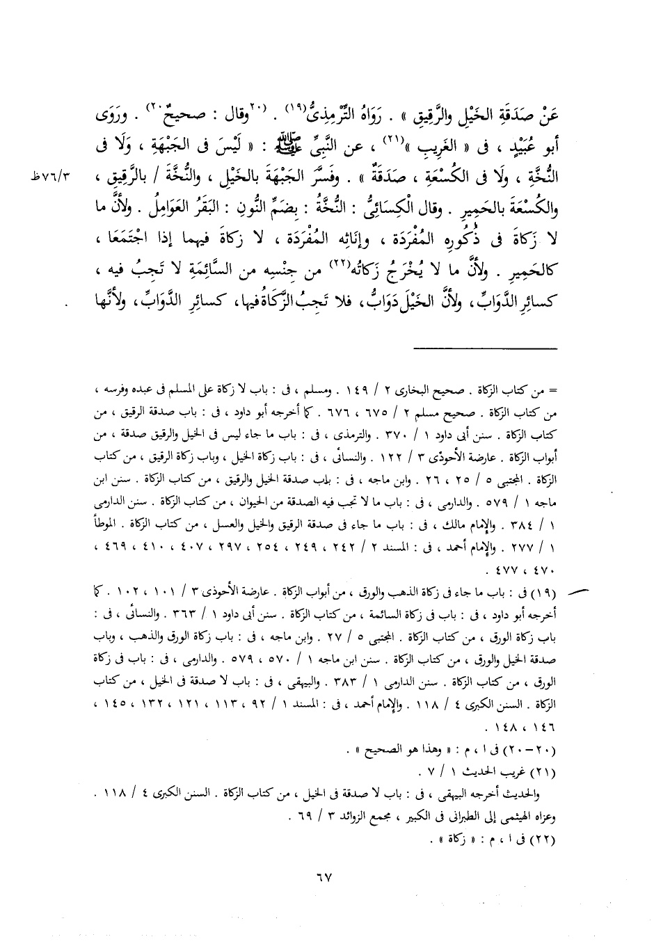 = من كتاب الزكاة. صحيح البخارى ٢/ ١٤٩. ومسلم، فى: باب لا زكاة على المسلم فى عبده وفرسه، من كتاب الزَّكَاة. صحيح مسلم ٢/ ٦٧٥، ٦٧٦. كما أخرجه أبو داود، فى: باب صدقة الرقيق، من كتاب الزَّكَاة. سنن أبى داود ١/ ٣٧٠. والترمذى، فى: باب ما جاء ليس فى الخيل والرقيق صدقة، من أبواب الزَّكَاة. عارضة الأحوذى ٣/ ١٢٢. والنسائى، فى: باب زكاة الخيل، وباب زكاة الرقيق، من كتاب الزكاة. المجتبى ٥/ ٢٥، ٢٦. وابن ماجه، فى: باب صدقة الخيل والرقيق، من كتاب الزَّكاة. سنن ابن ماجه ١/ ٥٧٩. والدارمى، فى: باب ما لا تجب فيه الصدقة من الحيوان، من كتاب الزَّكَاة. سنن الدارمى ١/ ٣٨٤. والإمام مالك، فى: باب ما جاء فى صدقة الرقيق والخيل والعسل، من كتاب الزَّكَاة. الموطأ ١/ ٢٧٧. والإمام أحمد، فى: المسند ٢/ ٢٤٢، ٢٤٩، ٢٥٤، ٢٩٧، ٤٠٧، ٤١٠، ٤٦٩، ٤٧٠، ٤٧٧.