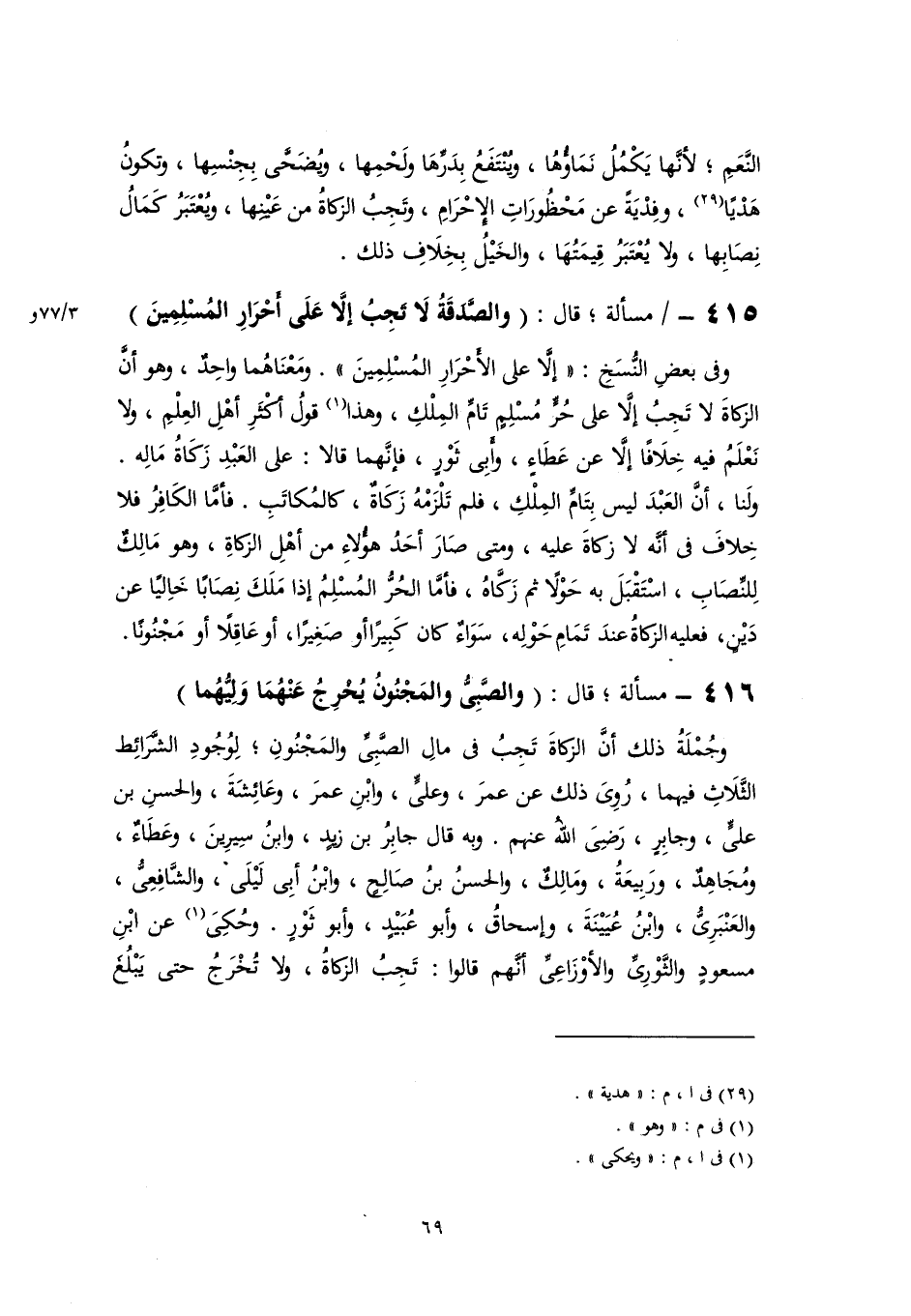 ٤١٥ - مسألة؛ قال: (والصَّدَقَةُ لَا تَجِبُ إلَّا عَلَى أحْرَارِ المُسْلِمِينَ)