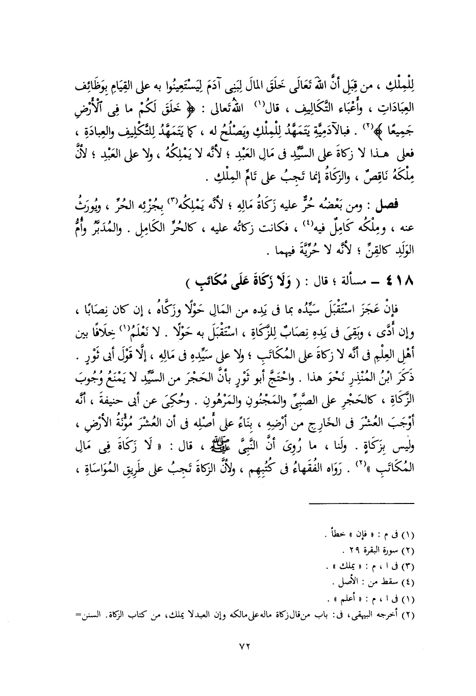 (٢) أخرجه البيهقى، فى: باب من قال زكاة ماله على مالكه وإن العبد لا يملك، من كتاب الزكاة. السنن=