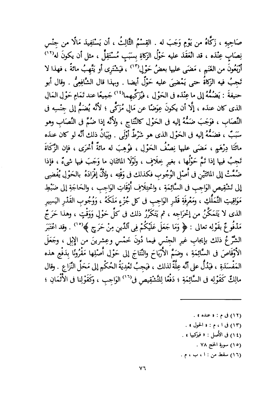 صَاحِبِهِ، زَكَّاهُ من يَوْمِ وَجَبَ له. القِسْمُ الثَّالِثُ، أن يَسْتَفِيدَ مَالًا من جِنْسِ نِصَابٍ عِنْدَه، قد انْعَقَدَ عليه حَوْلُ الزكاةِ بِسَبَبٍ مُسْتَقِلٌّ، مثل أن يكونَ له (١٢) أَرْبَعُونَ من الغَنَمِ، مَضَى عليها بعضُ حَوْلٍ (١٣)، فيَشْتَرِى أو يَتَّهِبُ مائةً، فهذا لا تَجِبُ فيه الزكاةُ حتى يَمْضِىَ عليه حَوْلٌ أيضًا. وبهذا قال الشَّافِعِىُّ. وقال أبو حنيفةَ: يَضُمُّهُ إلى ما عِنْدَه فى الحَوْلِ، فيُزَكِّيهِما (١٤) جَمِيعًا عند تَمَامِ حَوْلِ المَالِ الذى كان عندَه، إلَّا أن يكونَ عِوَضًا عن مَالٍ مُزَكًّى؛ لأنَّه يُضَمُّ إلى جِنْسِه فى النِّصَابِ، فوَجَبَ ضَمُّهُ إليه فى الحَوْلِ كالنِّتَاجِ، ولأنَّه إذا ضُمَّ فى النِّصَابِ وهو سَبَبٌ، فضَمُّهُ إليه فى الحَوْلِ الذى هو شَرْطٌ أوْلَى. وبَيَانُ ذلك أنَّه لو كان عندَه مائَتَا دِرْهَمٍ، مَضَى عليها نِصْفُ الحَوْلِ، فوُهِبَ له مائةٌ أُخْرَى، فإن الزَّكَاةَ تَجِبُ فيها إذا تَمَّ حَوْلُها، بغيرِ خِلَافٍ، ولَوْلَا المائتَانِ ما وَجَبَ فيها شىءٌ، فإذا ضُمَّتْ إلى المائتَيْنِ فى أصْلِ الوُجُوبِ فكذلك فى وَقْتِه، ولأنَّ إفْرَادَهُ بالحَوْلِ يُفْضِى إلى تَشْقِيصِ الوَاجِبِ فى السَّائِمَةِ، واخْتِلَافِ أوْقَاتِ الوَاجِبِ، والحَاجَةِ إلى ضَبْطِ مَوَاقِيتِ التَّمَلُّكِ، ومَعْرِفَةِ قَدْرِ الوَاجِبِ فى كل جُزْءٍ مَلَكَهُ، وَوُجُوبِ القَدْرِ اليَسِيرِ الذى لا يَتَمَكَّنُ من إخْرَاجِه، ثم يَتَكَرَّرُ ذلك فى كلِّ حَوْلٍ وَوَقْتٍ، وهذا حَرَجٌ مَدْفُوعٌ بقَوْلِه تعالى: {وَمَا جَعَلَ عَلَيْكُمْ فِي الدِّينِ مِنْ حَرَجٍ} (١٥). وقد اعْتَبَرَ الشَّرْعُ ذلك بإيجابِ غيرِ الجِنْسِ فيما دُونَ خَمْسٍ وعِشرينَ من الإبِلِ، وجَعَلَ الأوْقَاصَ فى السَّائِمَةِ، وضَمَّ الأرْبَاحَ والنِّتَاجَ إلى حَوْلِ أَصْلِها مَقْرُونًا بِدَفْعِ هذه المَفْسَدَةِ، فيَدُلُّ على أنَّه عِلَّةٌ لذلك، فيَجِبُ تَعْدِيَةُ الحُكْمِ إلى مَحَلِّ النِّزَاعِ. وقال مالِكٌ كَقَوْلِه فى السَّائِمَةِ؛ دَفْعًا لِلتَّشْقِيصِ فى (١٦) الوَاجِبِ، كقَوْلِنا فى الأثْمَانِ؛