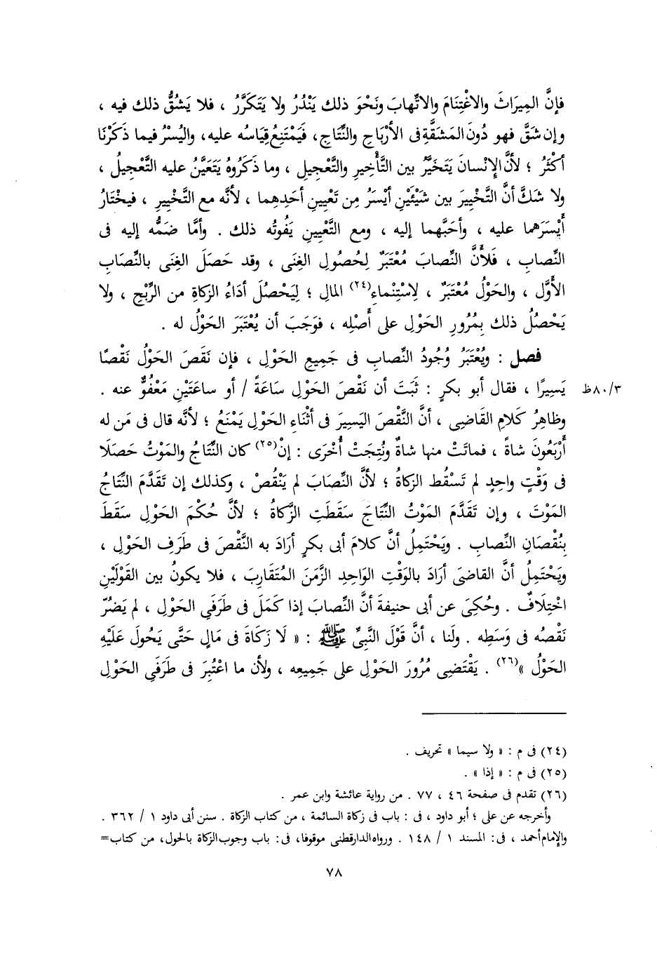 فصل: ويُعْتَبَرُ وُجُودُ النِّصابِ فى جَمِيعِ الحَوْلِ، فإن نَقَصَ الحَوْلُ نَقْصًا يَسِيرًا، فقال أبو بكرٍ: ثَبَتَ أن نَقْصَ الحَوْلِ سَاعَةً أو ساعَتَيْنِ مَعْفُوٌّ عنه. وظاهِرُ كَلامِ القَاضِى، أنَّ النَّقْصَ اليَسِيرَ فى أثْنَاءِ الحَوْلِ يَمْنَعُ؛ لأنَّه قال فى مَن له أرْبَعُونَ شاةً، فماتَتْ منها شاةٌ ونُتِجَتْ أُخْرَى: إنْ (٢٥) كان النِّتَاجُ والمَوْتُ حَصَلَا فى وَقْتٍ واحِدٍ لم تَسْقُط الزكاةُ؛ لأنَّ النِّصَابَ لم يَنْقُصْ، وكذلك إن تَقَدَّمَ النِّتَاجُ المَوْتَ، وإن تَقَدَّمَ المَوْتُ النِّتَاجَ سَقَطَتِ الزَّكَاةُ؛ لأنَّ حُكْمَ الحَوْلِ سَقَطَ بِنُقْصَانِ النِّصابِ. ويَحْتَمِلُ أنَّ كلامَ أبى بكرٍ أرَادَ به النَّقْصَ فى طَرَفِ الحَوْلِ، ويَحْتَمِلُ أنَّ القاضىَ أرَادَ بالوَقْتِ الوَاحِدِ الزَّمَنَ المُتَقَارِبَ، فلا يكونُ بين القَوْلَيْنِ اخْتِلَافٌ. وحُكِىَ عن أبى حنيفةَ أنَّ النِّصابَ إذا كَمَلَ فى طَرَفَىِ الحَوْلِ، لم يَضُرّ نَقْصُه فى وَسَطِه. ولَنا، أنَّ قَوْلَ النَّبِىِّ -صَلَّى اللهُ عَلَيْهِ وَسَلَّمَ-: "لَا زَكَاةَ فى مَالٍ حَتَّى يَحُولَ عَلَيْهِ الحَوْلُ" (٢٦). يَقْتَضِى مُرُورَ الحَوْلِ على جَمِيعِه، ولأن ما اعْتُبِرَ فى طَرَفَىِ الحَوْلِ