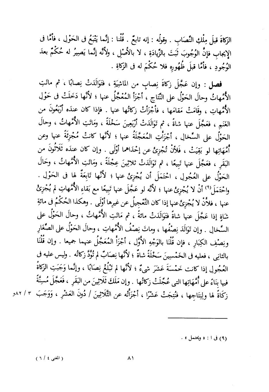 فصل: وإن عَجَّلَ زكاةَ نِصابٍ من الماشِيَةِ، فتَوَالَدَتْ نِصابًا، ثم ماتَتِ الأُمَّهاتُ وحالَ الحَوْلُ على النِّتَاجِ، أجْزَأ المُعجَّلُ عنها؛ لأنَّها دَخَلَتْ فى حَوْلِ الأُمَّهاتِ، وقَامَتْ مَقامَها، فأجْزَأتْ زكاتُها عنها. فإذا كان عندَه أَرْبَعُونَ من الغَنَمِ، فعَجَّلَ عنها شاةً، ثم تَوَالَدَتْ أرْبَعِينَ سَخْلَةً، ومَاتَتِ الأُمَّهاتُ، وحالَ الحَوْلُ على السِّخالِ، أجْزَأَتِ المُعَجَّلَةُ عنها؛ لأنَّها كانتْ مُجْزِئَةً عنها وعن أُمَّهَاتِها لو بَقِيَتْ، فَلأنْ تُجْزِئ عن إحْدَاهما أوْلَى. وإن كان عندَه ثَلَاثُونَ من البَقَرِ، فعَجَّلَ عنها تَبِيعًا، ثم تَوَالَدَتْ ثلاثِينَ عِجْلَةً، ومَاتَتِ الأُمَّهاتُ، وحَالَ الحَوْلُ على العُجُولِ، احْتَمَلَ أن يُجْزِئ عنها؛ لأنَّها تَابِعَةٌ لها فى الحَوْلِ. واحْتَمَلَ (٩) أنْ لا يُجْزِئ عنها؛ لأنَّه لو عَجَّلَ عنها تَبِيعًا مع بَقاءِ الأُمَّهاتِ لم يُجْزِئ عنها، فلأنْ لا يُجْزِئ عنها إذا كان التَّعْجِيلُ عن غيرِها أوْلَى. وهكذا الحُكْمُ فى مائةِ شَاةٍ إذا عَجَّلَ عنها شاةً فتَوَالَدَتْ مائةً، ثم مَاتَتِ الأُمَّهاتُ، وحالَ الحَوْلُ على السِّخالِ. وإن تَوَالَدَ نِصْفُها، وماتَ نِصْفُ الأُمَّهاتِ، وحالَ الحَوْلُ على الصِّغَارِ ونِصْفِ الكِبَارِ، فإن قُلْنَا بالوَجْهِ الأوَّل، أجْزَأ المُعَجَّلُ عنهما جميعا. وإن قُلْنَا بالثانِى، فعليه فى الخَمْسِينَ سَخْلَةً شاةٌ؛ لأنَّها نِصَابٌ لم تُؤَدَّ زكاتُه. وليس عليه فى العُجُولِ إذا كانت خَمْسَةَ عَشَرَ شىءٌ؛ لأنَّها لم تَبْلُغْ نِصَابًا، وإنَّما وَجَبَتِ الزَّكَاةُ فيها بِنَاءً على أُمَّهَاتِها التى عُجِّلَتْ زكاتُها. وإن مَلَكَ ثَلَاثِينَ من البَقَرِ، فَعَجَّلَ مُسِنَّةً زكَاةً لها ولِنِتَاجِها، فنُتِجَتْ عَشْرًا، أجْزَأتْه عن الثَّلَاثِينَ دُونَ العَشْرِ، وَوَجَبَ