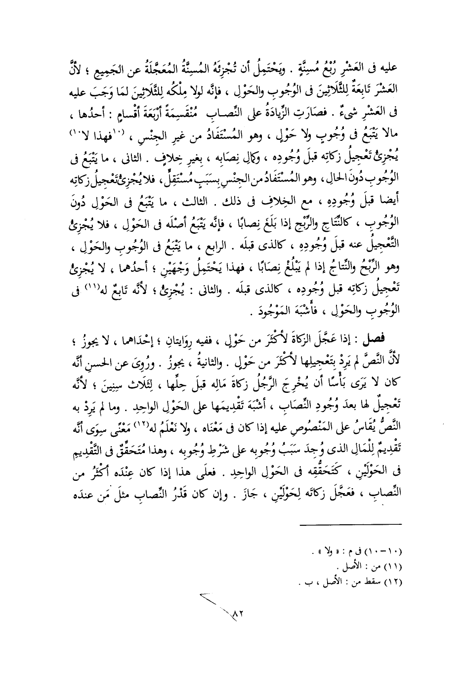 عليه فى العَشْرِ رُبْعُ مُسِنَّةٍ. ويَحْتَمِلُ أن تُجْزِئَهُ المُسِنَّةُ المُعَجَّلَةُ عن الجَمِيعِ؛ لأنَّ العَشْرَ تَابِعَةٌ لِلثَّلَاثِينَ فى الوُجُوبِ والحَوْلِ، فإنَّه لولا مِلْكُه لِلثَّلَاثِينَ لمَا وَجَبَ عليه فى العَشْرِ شىءٌ. فصَارَتِ الزِّيادَةُ على النِّصابِ مُنْقَسِمَةً أرْبَعَةَ أقْسامٍ: أحدُها، مالا يَتْبَعُ فى وُجُوبٍ ولا حَوْلٍ، وهو المُسْتَفَادُ من غيرِ الجِنْس، [فهذا لا] (١٠) يُجْزِئ تَعْجِيلُ زكاتِه قبلَ وُجُودِه، وكمالِ نِصَابِه، بِغيرِ خِلافٍ. الثانى، ما يَتْبَعُ فى الوُجُوبِ دُونَ الحالِ، وهو المُسْتَفَادُ من الجِنْسِ بِسَبَبٍ مُسْتَقِلٍّ، فلا يُجْزِئ تَعْجِيلُ زكاتِه أيضا قبلَ وُجُودِهِ، مع الخِلافِ فى ذلك. الثالث، ما يَتْبَعُ فى الحَوْلِ دُونَ الوُجُوبِ، كالنِّتَاجِ والرِّبْحِ إذا بَلَغَ نِصابًا، فإنَّه يَتْبَعُ أصْلَه فى الحَوْلِ، فلا يُجْزِئ التَّعْجِيلُ عنه قبلَ وُجُودِهِ، كالذى قبلَه. الرابع، ما يَتْبَعُ فى الوُجُوبِ والحَوْلِ، وهو الرِّبْحُ والنِّتاجُ إذا لم يَبْلُغْ نِصَابًا، فهذا يَحْتَمِلُ وَجْهَيْنِ؛ أحدُهما، لا يُجْزِئ تَعْجِيلُ زكاتِه قبل وُجُودِه، كالذى قبلَه. والثانى: يُجْزِئ؛ لأنَّه تَابعٌ له (١١) فى الوُجُوبِ والحَوْلِ، فأشْبَهَ المَوْجُودَ.
