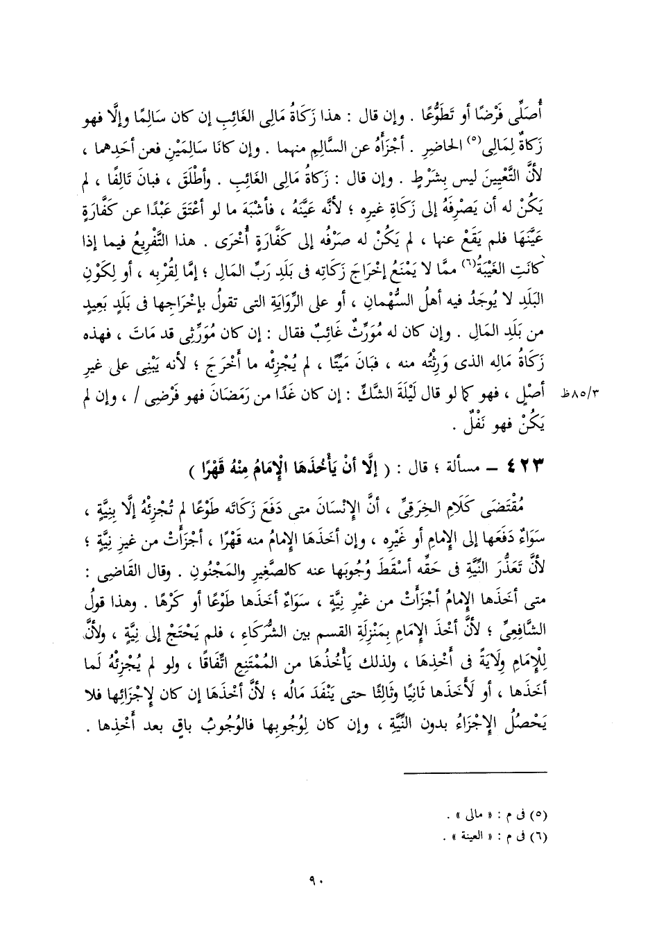 مُقْتَضَى كَلَامِ الخِرَقِىِّ، أنَّ الإنْسَانَ متى دَفَعَ زَكَاتَه طَوْعًا لم تُجْزِئْهُ إلَّا بِنِيَّةٍ، سَوَاءٌ دَفَعَها إلى الإمامِ أو غَيْرِه، وإن أخَذَهَا الإمامُ منه قَهْرًا، أجْزَأَتْ من غيرِ نِيَّةٍ؛ لأنَّ تَعَذُّرَ النِّيَّةِ فى حَقِّه أسْقَطَ وُجُوبَها عنه كالصَّغِيرِ والمَجْنُونِ. وقال القَاضِى: متى أخَذَها الإمامُ أجْزَأَتْ من غيْرِ نِيَّةٍ، سَوَاءٌ أخَذَها طَوْعًا أو كَرْهًا. وهذا قولُ الشَّافِعِىِّ؛ لأنَّ أخْذَ الإمَامِ بِمَنْزِلَةِ القسم بين الشُّرَكَاءِ، فلم يَحْتَجْ إلى نِيَّةٍ، ولأنَّ لِلإمَامِ وِلَايَةً فى أخْذِهَا، ولذلك يَأْخُذُهَا من المُمْتَنِعِ اتِّفَاقًا، ولو لم يُجْزِئْهُ لَما أخَذَها، أو لَأخَذَها ثَانِيًا وثَالِثًا حتى يَنْفَدَ مَالُه؛ لأنَّ أخْذَهَا إن كان لِإجْزَائِها فلا يَحْصُلُ الإجْزَاءُ بدون النِّيَّةِ، وإن كان لِوُجُوبِها فالوُجُوبُ باقٍ بعد أخْذِها.