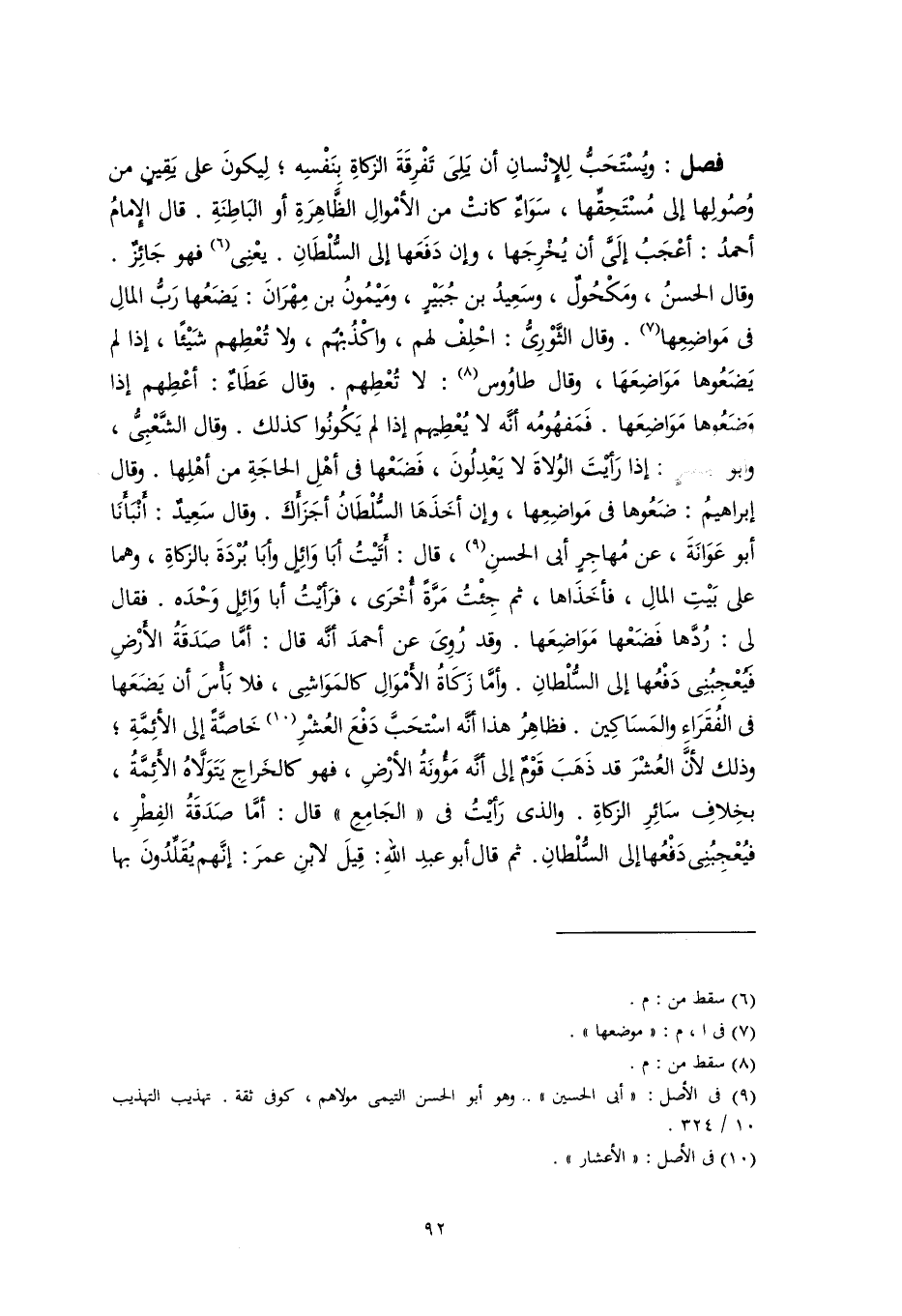 فصل: ويُسْتَحَبُّ لِلإنْسانِ أن يَلىَ تَفْرِقَةَ الزكاةِ بنَفْسِه؛ لِيكونَ على يَقِينٍ من وُصُولِها إلى مُسْتَحِقِّها، سَوَاءٌ كانتْ من الأمْوالِ الظَّاهِرَةِ أو البَاطِنَةِ. قال الإمامُ أحمدُ: أعْجَبُ إلَىَّ أن يُخْرِجَها، وإن دَفَعَها إلى السُّلْطَانِ. يعْنِى (٦) فهو جَائِزٌ. وقال الحسنُ، ومَكْحُولٌ، وسَعِيدُ بن جُبَيْرٍ، ومَيْمُونُ بن مِهْرَانَ: يَضَعُها رَبُّ المالِ فى مَواضِعِها (٧). وقال الثَّوْرِىُّ: احْلِفْ لهم، واكْذُبْهُم، ولا تُعْطِهم شَيْئًا، إذا لم يَضَعُوها مَوَاضِعَهَا، وقال طاوُوس (٨): لا تُعْطِهم. وقال عَطَاءٌ: أعْطِهم إذا وَضَعُوها مَوَاضِعَها. فَمَفهُومُه أنَّه لا يُعْطِيهم إذا لم يَكُونُوا كذلك. وقال الشَّعْبِىُّ، وأبو جعفرٍ: إذا رَأَيْتَ الوُلاةَ لا يَعْدِلُونَ، فَضَعْها فى أهْلِ الحاجَةِ من أهْلِها. وقال إبراهيمُ: ضَعُوها فى مَواضِعِها، وإن أخَذَهَا السُّلْطَانُ أجزَأَكَ. وقال سَعِيدٌ: أنْبَأَنَا أبو عَوَانَةَ، عن مُهاجِرٍ أبى الحسنِ (٩)، قال: أتَيْتُ أبَا وَائِلٍ وأبَا بُرْدَةَ بالزكاةِ، وهما على بَيْتِ المالِ، فأخَذَاها، ثم جِئْتُ مَرَّةً أُخْرَى، فرَأَيْتُ أبا وَائِلٍ وَحْدَه. فقال لى: رُدَّها فَضَعْها مَوَاضِعَها. وقد رُوِىَ عن أحمدَ أنَّه قال: أمَّا صَدَقَةُ الأرْضِ فَيُعْجِبُنِى دَفْعُها إلى السُّلْطانِ. وأمَّا زَكَاةُ الأمْوَالِ كالمَوَاشِى، فلا بَأْسَ أن يَضَعَها فى الفُقَرَاء والمَسَاكِين. فظاهِرُ هذا أنَّه اسْتحَبَّ دَفْعَ العُشْرِ (١٠) خَاصَّةً إلى الأئِمَّةِ؛ وذلك لأنَّ العُشْرَ قد ذَهَبَ قَوْمٌ إلى أنَّه مَؤُونَةُ الأرْضِ، فهو كالخَراجِ يَتَوَلَّاهُ الأئِمَّةُ، بخِلافِ سَائِرِ الزكاةِ. والذى رَأَيْتُ فى "الجَامِعِ" قال: أمَّا صَدَقَةُ الفِطْرِ، فيُعْجِبُنِى دَفْعُها إلى السُّلْطانِ. ثم قال أبو عبدِ اللهِ: قِيلَ لابنِ عمرَ: إنَّهم يُقَلِّدُونَ بها