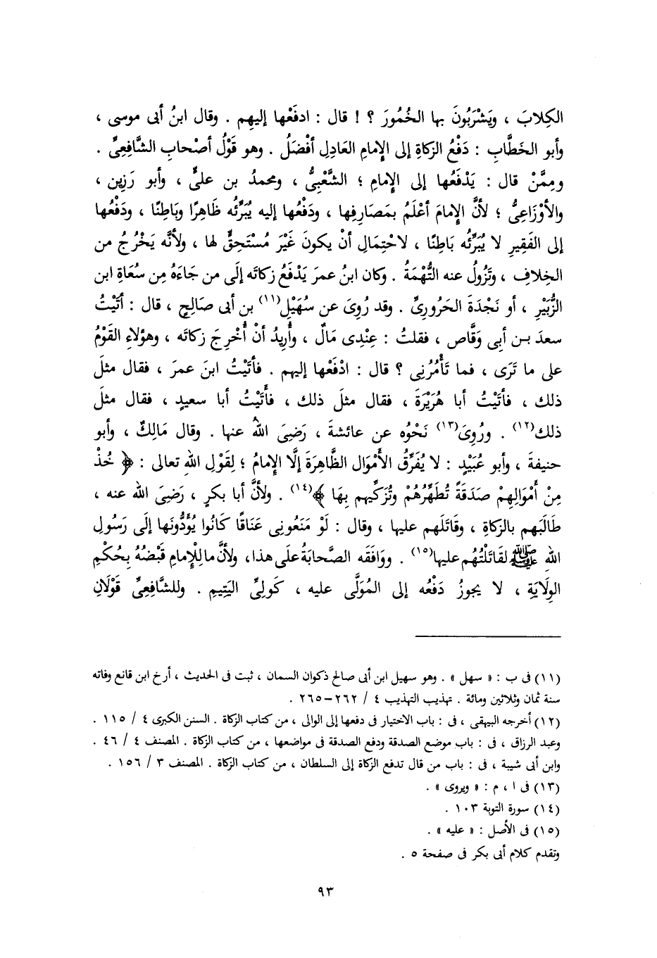(١٢) أخرجه البيهقى، فى: باب الاختيار فى دفعها إلى الوالى، من كتاب الزكاة. السنن الكبرى ٤/ ١١٥. وعبد الرزاق، فى: باب موضع الصدقة ودفع الصدقة فى مواضعها، من كتاب الزكاة. المصنف ٤/ ٤٦. وابن أبى شيبة، فى: باب من قال تدفع الزكاة إلى السلطان، من كتاب الزكاة. المصنف ٣/ ١٥٦.