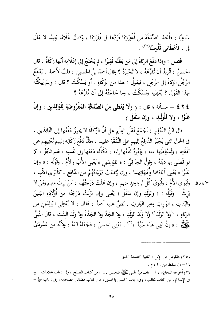 قال ابْنُ المُنْذِرِ: أجْمَعَ أهْلُ العِلْمِ على أنَّ الزَّكاةَ لا يجوزُ دَفْعُها إلى الوَالِدَينِ، في الحالِ التي يُجْبَرُ الدَّافِعُ إليهم على النَّفَقَةِ عليهم، ولأنَّ دَفْعَ زَكَاتِه إليهم تُغْنِيهِم عن نَفَقَتِه، وتُسْقِطُها عنه، ويَعُودُ نَفْعُها إليه، فكَأنَّه دَفَعَها إلى نَفسِه، فلم تَجُزْ، كما لو قَضَى بها دَيْنَهُ، وقولُ الخِرَقِيِّ: "للوَالِدَينِ" يَعْنِي الأبَ والأمَّ. وقَوْلُه: "وإن عَلَوْا" يَعْنِي آبَاءَهما وأُمَّهَاتِهما، وإن ارْتَفَعَتْ دَرَجَتُهُمْ من الدَّافِعِ، كأبَوَي الأبِ، وأبوَيِ الأمِّ، وأَبَوَيْ كُلِّ وَاحِدٍ منهم، وإن عَلَتْ دَرَجَتُهُم، مَنْ يَرِثُ منهم ومَنْ لا يَرِثُ. وقَوْلُه: "والوَلَدِ وإن سَفَلَ" يَعْنِي وإن نَزَلَتْ دَرَجَتُه من أولَادِهِ البَنِينَ والبَنَاتِ، الوَارِثِ وغيرِ الوَارِثِ. نَصَّ عليه أحمدُ، فقال: لا يُعْطِى الوَالِدَينِ من الزكاةِ، [ولا الوَلَدَ] (١) ولا وَلَدَ الوَلَدِ، ولا الجَدَّ ولا الجَدَّةَ ولا وَلَدَ البِنْتِ، قال النَّبِيُّ -صَلَّى اللهُ عَلَيْهِ وَسَلَّمَ-: "إنَّ ابْنِي هذَا سَيِّدٌ" (٢). يَعْنِي الحسنَ، فجَعَلَهُ ابْنَهُ، ولأنَّه من عَمُودَيْ