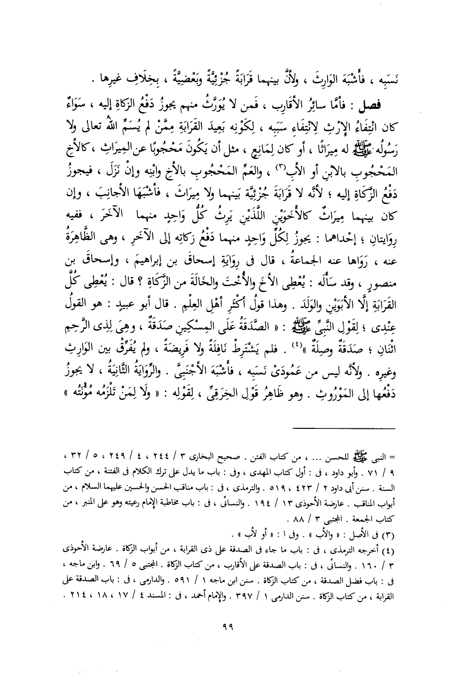 فصل: فأمَّا سائِرُ الأقَارِب، فَمن لا يُوَرَّثُ منهم يجوزُ دَفْعُ الزكاةِ إليه، سَوَاءٌ كان انْتِفَاءُ الإرْثِ لِانْتِفَاءِ سَبَبِه، لِكَوْنِه بَعِيدَ القَرَابَةِ مِمَّنْ لم يُسَمِّ اللهُ تعالى ولا رَسُولُه -صَلَّى اللهُ عَلَيْهِ وَسَلَّمَ- له مِيرَاثًا، أو كان لِمَانِعٍ، مثل أن يَكُونَ مَحْجُوبًا عن المِيرَاثِ، كالأخِ المَحْجُوبِ بالابْنِ أو الأبِ (٣)، والعَمِّ المَحْجُوبِ بالأخِ وابْنِه وإنْ نَزَلَ، فيجوزُ دَفْعُ الزَّكاةِ إليه؛ لأنَّه لا قَرَابَةَ جُزْئِيَّة بَينهما ولا مِيرَاثَ، فأشْبَهَا الأجانِبَ، وإن كان بينهما مِيرَاثٌ كالأخَوَيْنِ اللَّذَيْنِ يَرِثُ كُلُّ وَاحِدٍ منهما الآخَرَ، ففيه رِوَايتانِ؛ إحْداهما: يجوزُ لِكُلِّ وَاحِدٍ منهما دَفْعُ زكاتِه إلى الآخَرِ، وهي الظَّاهِرَةُ عنه، رَوَاها عنه الجماعةُ، قال في رِوَايَةِ إسحاقَ بن إبراهيمَ، وإسحاقَ بن منصورٍ، وقد سَألَه: يُعْطِي الأخَ والأُخْتَ والخَالَةَ من الزَّكَاةِ؟ قال: يُعْطِي كُلَّ القَرَابَةِ إلَّا الأبَوَيْنِ والوَلَدَ. وهذا قولُ أكْثَرِ أهْلِ العِلْمِ. قال أبو عبيدٍ: هو القولُ عِنْدِي؛ لِقَوْلِ النَّبِيِّ -صَلَّى اللهُ عَلَيْهِ وَسَلَّمَ-: "الصَّدَقَةُ عَلَى المِسْكِينِ صَدَقَةٌ، وهِيَ لِذِي الرَّحِمِ اثْنَانِ؛ صَدَقَةٌ وصِلَةٌ" (٤). فلم يَشْتَرِطْ نَافِلَةً ولا فَرِيضَةً، ولم يُفَرِّق بين الوَارِثِ وغيرِه. ولأنَّه ليس من عَمُودَيْ نَسَبِه، فأَشْبَهَ الأجْنَبِيَّ. والرِّوَايَةُ الثَّانِيَةُ، لا يجوزُ دَفْعُها إلى المَوْرُوثِ. وهو ظَاهِرُ قَوْلِ الخِرَقِيِّ، لِقَوْلِه: "ولَا لِمَنْ تَلْزَمُه مُؤْنَتُه"