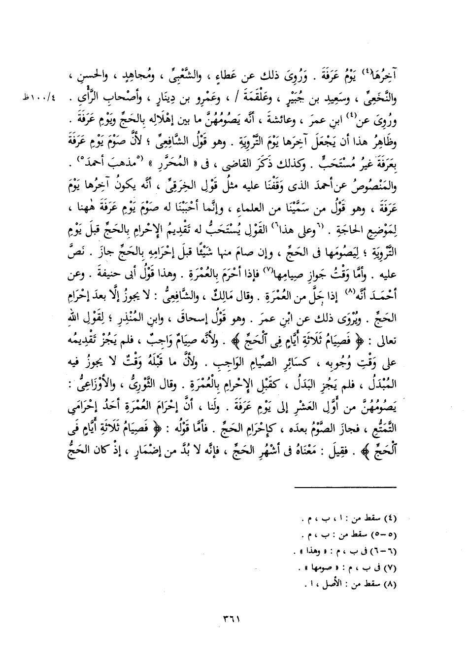 آخِرُهَا (٤) يَوْمُ عَرَفَةَ. وَرُوِىَ ذلك عن عَطاءٍ، والشَّعْبِىِّ، ومُجاهِدٍ، والحسنِ، والنَّخَعِىِّ، وسَعِيدِ بن جُبَيْرٍ، وعَلْقَمَةَ، وعَمْرِو بن دِينَارٍ، وأصْحابِ الرَّأْىِ. ورُوِىَ عن (٤) ابنِ عمرَ، وعائشةَ، أنَّه يَصُومُهُنَّ ما بين إهْلَالِه بِالحَجِّ ويَوْمِ عَرَفَةَ. وظَاهِرُ هذا أن يَجْعَلَ آخِرَها يَوْمَ التَّرْوِيَةِ. وهو قَوْلُ الشَّافِعِىِّ؛ لأنَّ صَوْمَ يَوْمِ عَرَفَةَ بِعَرَفَةَ غيرُ مُسْتَحَبٍّ. وكذلك ذَكَرَ القاضى، فى "المُحَرَّرِ" [مذهبَ أحمدَ] (٥). والمَنْصُوصُ عن أحمدَ الذى وَقَفْنَا عليه مثلُ قَوْلِ الخِرَقِىِّ، أنَّه يكونُ آخِرُها يَوْمَ عَرَفَةَ، وهو قَوْلُ من سَمَّيْنَا من العلماءِ، وإنَّما أحْبَبْنَا له صَوْمَ يَوْمِ عَرَفَةَ هاهنا، لِمَوْضِعِ الحاجَةِ. [وعلى هذا] (٦) القَوْلِ يُسْتَحَبُّ له تَقْدِيمُ الإِحْرامِ بالحَجِّ قبلَ يَوْمِ التَّرْوِيَةِ؛ لِيَصُومَها فى الحَجِّ، وإن صامَ منها شَيْئًا قبلَ إحْرَامِهِ بِالحَجِّ جازَ. نَصَّ عليه. وأمَّا وَقْتُ جَوازِ صِيامِها (٧) فإذا أحْرَمَ بِالعُمْرَةِ. وهذا قَوْلُ أبى حنيفةَ. وعن أحْمَدَ أنَّه (٨) إذا حَلَّ من العُمْرَةِ. وقال مَالِكٌ، والشَّافِعِىُّ: لا يجوزُ إلَّا بعدَ إحْرَامِ الحَجِّ. ويُرْوَى ذلك عن ابْنِ عمرَ. وهو قَوْلُ إسحاقَ، وابنِ المُنْذِرِ؛ لِقَوْلِ اللهِ تعالى: {فَصِيَامُ ثَلَاثَةِ أَيَّامٍ فِي الْحَجِّ}. ولأنَّه صِيَامٌ وَاجِبٌ، فلم يَجُزْ تَقْدِيمُه على وَقْتِ وُجُوبِه، كسَائِرِ الصِّيامِ الوَاجِبِ. ولأنَّ ما قَبْلَهُ وَقْتٌ لا يجوزُ فيه المُبْدَلُ، فلم يَجُزِ البَدَلُ، كقَبْلِ الإِحْرامِ بِالْعُمْرَةِ. وقال الثَّوْرِىُّ، والأوْزَاعِىُّ: يَصُومُهُنَّ من أَوَّلِ العَشْرِ إلى يَوْمِ عَرَفَةَ. ولَنا، أنَّ إحْرَامَ العُمْرَةِ أحَدُ إحْرَامَىِ التَّمَتُّعِ، فجازَ الصَّوْمُ بعدَه، كإِحْرَامِ الحَجِّ. فأمَّا قَوْلُه: {فَصِيَامُ ثَلَاثَةِ أَيَّامٍ فِي الْحَجِّ}. فقِيلَ: مَعْنَاهُ فى أشْهُرِ الحَجِّ، فإَّنه لا بُدَّ من إضْمَارٍ، إذْ كان الحَجُّ
