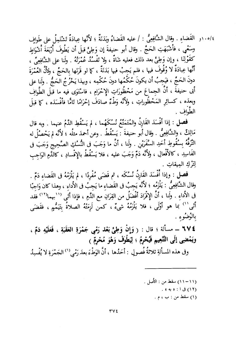 فصل: إذا أفْسَدَ القَارِنُ والمُتَمَتِّعُ نُسُكَهُما، لم يَسْقُطِ الدَّمُ عنهما. وبه قال مَالِكٌ، والشَّافِعِىُّ. وقال أبو حنيفةَ: يَسْقُطُ. وعن أحمدَ مثلُه؛ لأنَّه لم يَحْصُلْ له التَّرَفُّهُ بِسُقُوطِ أحَدِ السَّفَرَيْنِ. ولَنا، أنَّ ما وَجَبَ فى النُّسُكِ الصَّحِيحِ وَجَبَ فى الفَاسِدِ، كالأفْعالِ، ولأنَّه دَمٌ وَجَبَ عليه، فلا يَسْقُطُ بالإِفْسادِ، كالدَّمِ الوَاجِبِ لِتَرْكِ المِيقاتِ.