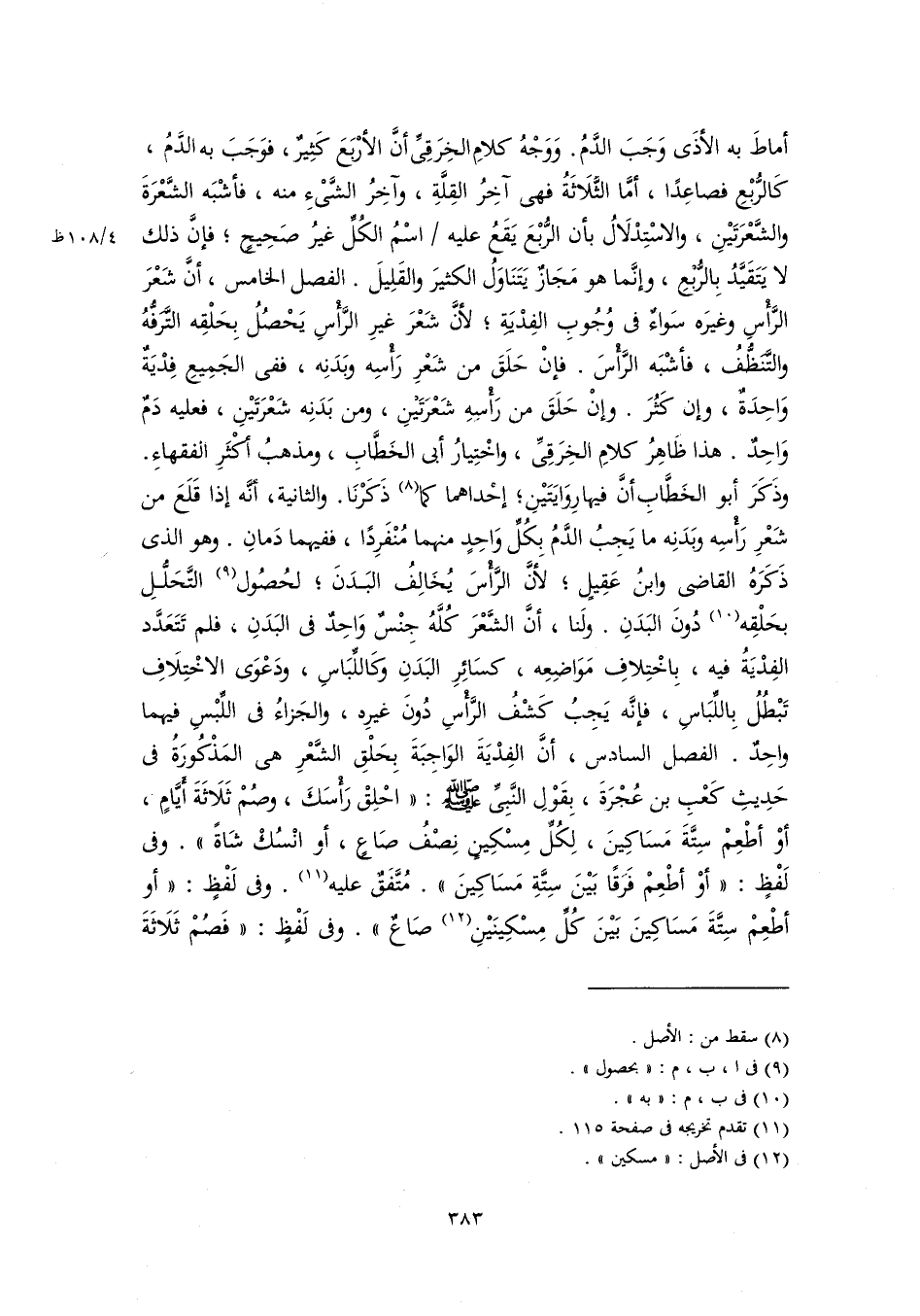 أماطَ به الأذَى وَجَبَ الدَّمُ. وَوَجْهُ كلامِ الخِرَقِىِّ أنَّ الأرْبَعَ كَثِيرٌ، فوَجَبَ به الدَّمُ، كَالرُّبْعِ فصاعِدًا، أمَّا الثَّلَاثَةُ فهى آخِرُ القِلَّةِ، وآخِرُ الشَّىْءِ منه، فأشْبَه الشَّعْرَةَ والشَّعْرَتَيْنِ، والاسْتِدْلَالُ بأن الرُّبْعَ يَقَعُ عليه اسْمُ الكُلِّ غيرُ صَحِيحٍ؛ فإنَّ ذلك لا يَتَقَيَّدُ بِالرُّبْعِ، وإنَّما هو مَجَازٌ يَتَنَاوَلُ الكثيرَ والقَلِيلَ. الفصل الخامس، أنَّ شَعْرَ الرَّأْسِ وغيرَه سَواءٌ فى: وُجُوبِ الفِدْيَةِ؛ لأنَّ شَعْرَ غيرِ الرَّأْسِ يَحْصُلُ بِحَلْقِه التَّرَفُّهُ والتَّنَظُّفُ، فأشْبَه الرَّأْسَ. فإنْ حَلَقَ من شَعْرِ رَأْسِه وبَدَنِه، ففى الجَمِيعِ فِدْيَةٌ وَاحِدَةٌ، وإن كَثُرَ. وإنْ حَلَقَ من رَأسِهِ شَعْرَتَينِ، ومن بَدَنِه شَعْرَتَيْنِ، فعليه دَمٌ وَاحِدٌ. هذا ظاهِرُ كلامِ الخِرَقِىِّ، واخْتِيارُ أبى الخَطَّابِ، ومذهبُ أكْثَرِ الفقهاءِ. وذَكَرَ أبو الخَطَّابِ أنَّ فيها رِوَايَتَيْنِ؛ إحْداهما كما (٨) ذَكَرْنَا. والثانية، أنَّه إذا قَلَعَ من شَعْرِ رَأْسِه وبَدَنِه ما يَجِبُ الدَّمُ بِكُلِّ وَاحِدٍ منهما مُنْفَرِدًا، ففيهما دَمانِ. وهو الذى ذَكَرَهُ القاضى وابنُ عَقِيلٍ، لأنَّ الرَّأْسَ يُخَالِفُ البَدَنَ؛ لحُصُول (٩) التَّحَلُّلِ بحَلْقِه (١٠) دُونَ البَدَنِ. ولَنا، أنَّ الشَّعْرَ كُلَّهُ جِنْسٌ وَاحِدٌ فى البَدَنِ، فلم تَتَعَدَّد الفِدْيَةُ فيه، بِاخْتِلافِ مَوَاضِعِه، كسَائِرِ البَدَنِ وكَاللِّبَاسِ، ودَعْوَى الاخْتِلَافِ تَبْطُلُ بِاللِّبَاسِ، فإنَّه يَجِبُ كَشْفُ الرَّأْسِ دُونَ غيرِه، والجَزاءُ فى اللِّبْسِ فيهما واحِدٌ. الفصل السادس، أنَّ الفِدْيَةَ الوَاجبَةَ بِحَلْقِ الشَّعْرِ هى المَذْكُورَةُ فى حَدِيثِ كَعْبِ بن عُجْرَةَ، بِقَوْلِ النَّبِيِّ -صَلَّى اللهُ عَلَيْهِ وَسَلَّمَ-: "احْلِقْ رَأْسَكَ، وصُمْ ثَلَاثَةَ أَيَّامٍ، أوْ أطْعِمْ سِتَّةَ مَسَاكِينَ، لِكُلِّ مِسْكِينٍ نِصْفُ صَاعٍ، أو انْسُكْ شَاةً". وفى لَفْظٍ: "أوْ أطْعِمْ فَرَقًا بَيْنَ سِتَّةِ مَسَاكِينَ". مُتَّفَقٌ عليه (١١). وفى لَفْظٍ: "أو أطْعِمْ سِتَّةَ مَسَاكِينَ بَيْنَ كُلِّ مِسْكِينَيْنِ (١٢) صَاعٌ". وفى لَفْظٍ: "فَصُمْ ثَلَاثَةَ
