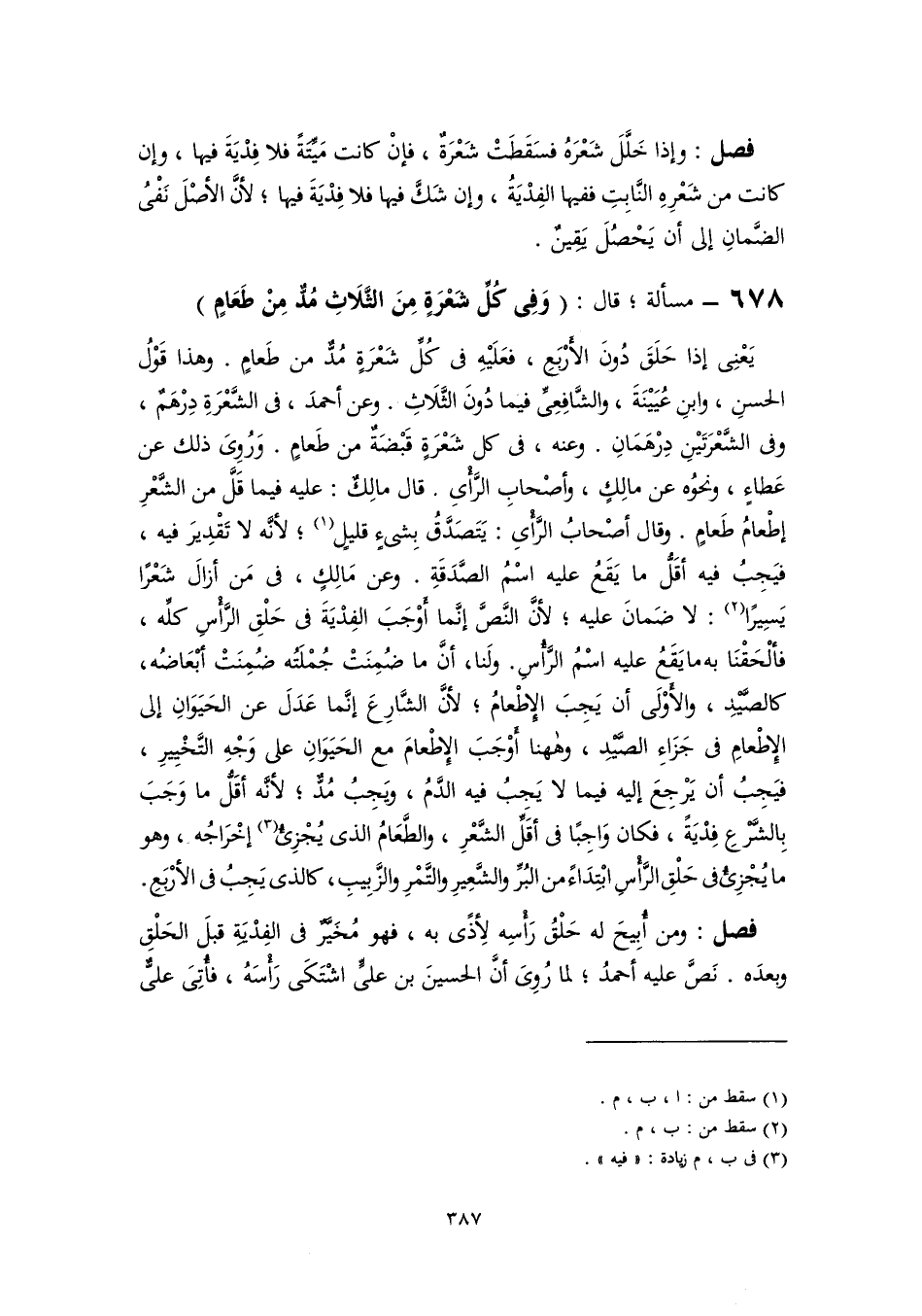 ٦٧٨ - مسألة؛ قال: (وَفِى كُلِّ شَعْرَةٍ مِنَ الثَّلَاثِ مُدٌّ مِنْ طَعَامٍ)