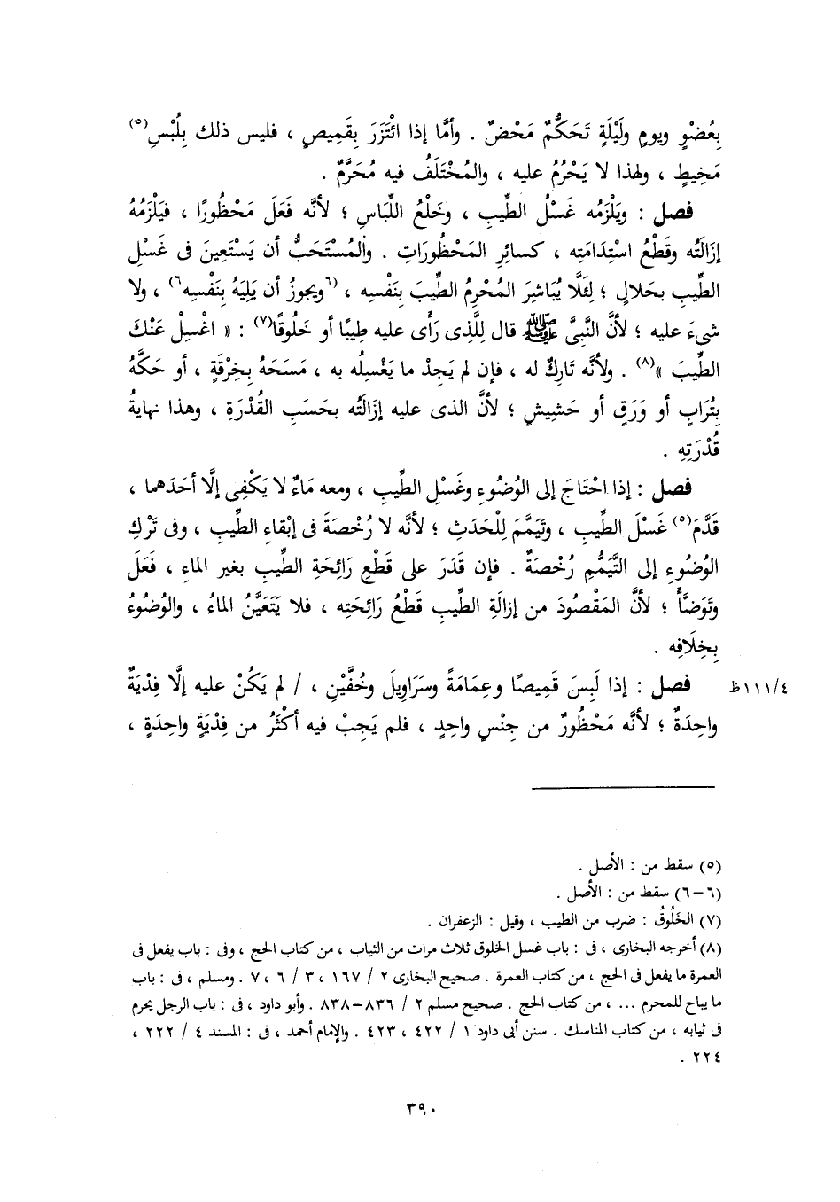 فصل: ويَلْزَمُه غَسْلُ الطِّيبِ، وخَلْعُ اللِّبَاسِ؛ لأنَّه فَعَلَ مَحْظُورًا، فيَلْزَمُهُ إزَالَتُه وقَطْعُ اسْتِدَامَتِه، كسائِرِ المَحْظُورَاتِ. والمُسْتَحَبُّ أن يَسْتَعِينَ فى غَسْلِ الطِّيبِ بحَلالٍ؛ لِئَلَّا يُبَاشِرَ المُحْرِمُ الطِّيبَ بِنَفْسِه، [ويجوزُ أن يَلِيَهُ بِنَفْسِه] (٦)، ولا شىءَ عليه؛ لأنَّ النَّبِىَّ -صَلَّى اللهُ عَلَيْهِ وَسَلَّمَ- قال لِلَّذِى رَأَى عليه طِيبًا أو خَلُوقًا (٧): "اغْسِلْ عَنْكَ الطِّيبَ" (٨). ولأنَّه تَارِكٌ له، فإن لم يَجِدْ ما يَغْسِلُه به، مَسَحَهُ بِخِرْقَةٍ، أو حَكَّهُ بِتُرَابٍ أو وَرَقٍ أو حَشِيشٍ؛ لأنَّ الذى عليه إزَالَتُه بحَسَبِ القُدْرَةِ، وهذا نهايةُ قُدْرَتِهِ.