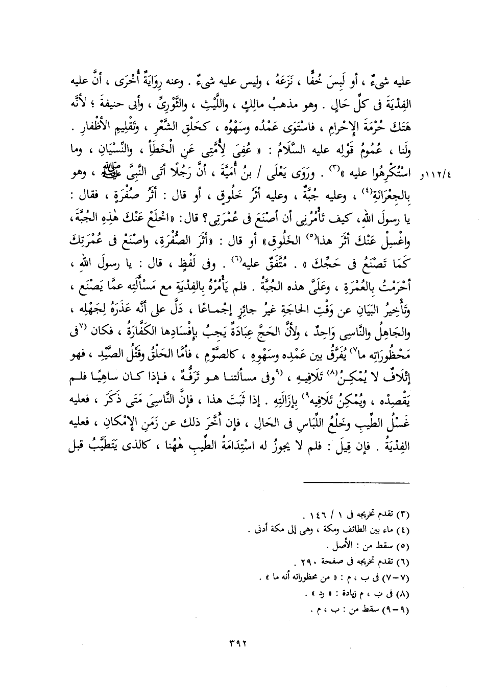 عليه شىءٌ، أو لَبِسَ خُفًّا، نَزَعَهُ، وليس عليه شىءٌ. وعنه رِوَايَةٌ أُخْرَى، أنَّ عليه الفِدْيَةَ فى كلِّ حَالٍ. وهو مذهبُ مالِكٍ، واللَّيْثِ، والثَّوْرِىِّ، وأبي حنيفةَ؛ لأنَّه هَتَكَ حُرْمَةَ الإِحْرامِ، فاسْتَوَى عَمْدُه وسَهْوُه، كحَلْقِ الشَّعْرِ، وتَقْلِيمِ الأظْفارِ. ولَنا، عُمُومُ قَوْلِه عليه السَّلَامُ: "عُفِىَ لِأُمَّتِى عَنِ الْخَطَأِ، والنِّسْيَانِ، وما اسْتُكْرِهُوا عليه" (٣). ورَوَى يَعْلَى بنُ أُمَيَّةَ، أنَّ رَجُلًا أتَى النَّبِىَّ -صَلَّى اللهُ عَلَيْهِ وَسَلَّمَ-، وهو بِالجِعْرَانَةِ (٤)، وعليه جُبَّةٌ، وعليه أثَرُ خَلُوقٍ، أو قال: أثَرُ صُفْرَةٍ، فقال: يا رسولَ اللهِ، كيف تَأْمُرُنِى أن أصْنَعَ فى عُمْرَتِى؟ قال: "اخْلَعْ عَنْكَ هذِهِ الجُبَّةَ، واغْسِلْ عَنْكَ أثَرَ هذا (٥) الخَلُوقِ" أو قال: "أثَرَ الصُّفْرَةِ، واصْنَعْ فى عُمْرَتِكَ كَمَا تَصْنَعُ فى حَجِّكَ". مُتَّفَقٌ عليه (٦). وفى لَفْظٍ، قال: يا رسولَ اللهِ، أحْرَمْتُ بِالعُمْرَةِ، وعَلَىَّ هذه الجُبَّةُ. فلم يَأْمُرْهُ بِالفِدْيَةِ مع مَسْأَلَتِه عمَّا يَصْنَع، وتَأْخِيرُ البَيَانِ عن وَقْتِ الحاجَةِ غيرُ جائِزٍ إجْماعًا، دَلَّ على أنَّه عَذَرَهُ لِجَهْلِه، والجَاهِلُ والنَّاسِى وَاحِدٌ، ولأنَّ الحَجَّ عِبَادَةٌ يَجِبُ بإِفْسَادِها الكَفَّارَةُ، فكان [فى مَحْظُورَاتِه ما] (٧) يُفرَّقُ بين عَمْدِه وسَهْوِهِ، كالصَّوْمِ، فأمَّا الحَلْقُ وقَتْلُ الصَّيْدِ، فهو إتْلَافٌ لا يُمْكِنُ (٨) تَلَافِيهِ، [وفى مسألتنا هو تَرَفُّهٌ، فإذا كان ساهِيًا فلم يَقْصِدْه، ويُمْكِنُ تَلَافِيه] (٩) بِإزَالَتِهِ. إذا ثَبَتَ هذا، فإنَّ النَّاسِىَ مَتَى ذَكَرَ، فعليه غَسْلُ الطِّيبِ وخَلْعُ اللِّبَاسِ فى الحَالِ، فإن أَخَّرَ ذلك عن زَمَنِ الإِمْكانِ، فعليه الفِدْيَةُ. فإن قِيلَ: فلم لا يجوزُ له اسْتِدَامَةُ الطِّيبِ هاهُنا، كالذى يَتَطَيَّبُ قبل