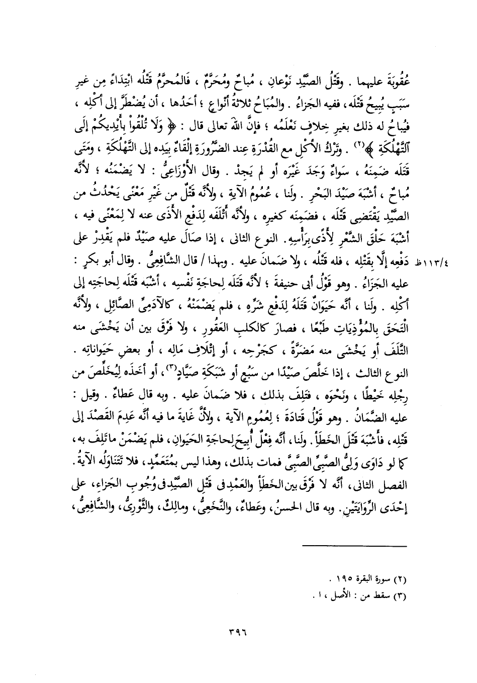 عُقُوبَةَ عليهما. وقَتْلُ الصَّيْدِ نَوْعانِ، مُباحٌ ومُحَرَّمٌ، فَالمُحرَّمُ قَتْلُه ابْتِدَاءً مِن غيرِ سَبَبٍ يُبِيحُ قَتْلَه، ففيه الجَزاءُ. والمُبَاحُ ثلاثةُ أنْواعٍ؛ أحَدُها، أن يُضْطَرَّ إلى أكْلِه، فيُباحُ له ذلك بغيرِ خِلافٍ نَعْلَمُه؛ فإنَّ اللهَ تعالى قال: {وَلَا تُلْقُوا بِأَيْدِيكُمْ إِلَى التَّهْلُكَةِ} (٢). وتَرْكُ الأكْلِ مع القُدْرَةِ عِند الضَّرورَةِ إلْقَاءٌ بِيَدِه إلى التَّهْلُكَةِ، ومَتَى قَتَلَه ضَمِنَهُ، سَواءٌ وَجَدَ غَيْرَه أو لم يَجِدْ. وقال الأَوْزَاعِىُّ: لا يَضْمَنُه؛ لأنَّه مُباحٌ، أشْبَهَ صَيْدَ البَحْرِ. ولَنا، عُمُومُ الآيةِ، ولأنَّه قَتْلٌ من غَيْرِ مَعْنًى يَحْدُثُ من الصَّيْدِ يَقْتَضِى قَتْلَه، فضَمِنَه كغيرِه، ولأنَّه أتْلَفَه لِدَفْعِ الأذَى عنه لا لِمَعْنًى فيه، أشْبَهَ حَلْقَ الشَّعْرِ لِأذًى بِرأسِهِ. النوع الثاني، إذا صَالَ عليه صَيْدٌ فلم يَقْدِرْ على دَفْعِه إلَّا بِقَتْلِه، فله قَتْلُه، ولا ضَمانَ عليه. وبهذا قال الشَّافِعِىُّ. وقال أبو بكرٍ: عليه الجَزَاءُ. وهو قَوْلُ أبى حنيفةَ؛ لأنَّه قَتَلَه لِحاجَةِ نَفْسِه، أشْبَه قَتْلَه لِحاجَتِه إلى أكْلِه. ولَنا، أنَّه حَيَوَانٌ قَتَلَهُ لِدَفْعِ شَرِّهِ، فلم يَضْمَنْهُ، كالآدَمِىِّ الصَّائِلِ، ولأنَّه الْتَحَقَ بالمُؤْذِيَاتِ طَبْعًا، فصارَ كالكلبِ العَقُورِ، ولا فَرْقَ بين أن يَخْشَى منه التَّلَفَ أَو يَخْشَى منه مَضَرَّةً، كجَرْحِه، أو إتْلَافِ مَالِه، أو بعضِ حَيَواناتِه. النوع الثالث، إذا خَلَّصَ صَيْدًا من سَبُعٍ أو شَبَكَةِ صَيَّادٍ (٣)، أو أخَذَه لِيُخَلِّصَ من رِجْلِه خَيْطًا، ونَحْوَه، فتَلِفَ بذلك، فلا ضَمانَ عليه. وبه قال عَطاءٌ. وقيل: عليه الضَّمَانُ. وهو قَوْلُ قَتادَةَ؛ لِعُمُومِ الآية، ولأنَّ غَايةَ ما فيه أنَّه عَدِمَ القَصْدَ إلى قَتْلِه، فأشْبَهَ قَتْلَ الخَطَأِ. ولَنا، أنَّه فِعْلٌ أُبِيحَ لِحاجَةِ الحَيَوانِ، فلم يَضْمَنْ ما تَلِفَ به، كما لو دَاوَى وَلِىُّ الصَّبِىِّ الصَّبِىَّ فمات بذلك، وهذا ليس بمُتَعَمِّدٍ، فلا تَتَنَاوَلُه الآيةُ. الفصل الثاني، أنَّه لا فَرْقَ بين الخَطَأِ والعَمْدِ فى قَتْلِ الصَّيْدِ فى وُجُوبِ الجَزاءِ، على إحْدَى الرِّوَايَتَيْنِ. وبه قال الحسنُ، وعَطاءٌ، والنَّخَعِىُّ، ومالِكٌ، والثَّوْرِىُّ، والشَّافِعِىُّ،