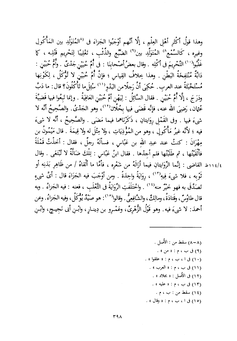 وهذا قولُ أكْثَرِ أهْلِ العِلْمِ، إلَّا أنَّهم أوْجَبُوا الجَزاءَ فى [المُتَوَلِّدِ بين المَأْكُولِ وغيرِه، كَالسِّمْعِ] (٨) المُتَوَلِّدِ بين (٩) الضَّبُعِ والذِّئْبِ، تَغْلِيبًا لِتَحْرِيمِ قَتْلِه، كما غَلَّبُوا (١٠) التَّحْرِيمَ فى أكْلِه. وقال بعضُ أصْحابِنَا: فى أُمِّ حُبَيْنٍ جَدْىٌ. وأُمُّ حُبَيْنٍ: دَابَّةٌ مُنْتَفِخَةُ البَطْنِ. وهذا خِلافُ القِياسِ؛ فإنَّ أُمَّ حُبَيْنٍ لا تُؤْكَلُ، لِكَوْنِها مُسْتَخْبَثَةً عند العربِ. حُكِىَ أنَّ رَجلًا من البَدْوِ (١١) سُئِلَ ما تَأْكُلُونَ؟ قال: ما دَبَّ ودَرَجَ، إلَّا أُمَّ حُبَيْنٍ. فقال السَّائِلُ: لِيَهْنِ أمَّ حُبَيْنٍ العَافِيَةُ. وإنما تَبِعُوا فيها قَضِيَّةَ عُثمان، رَضِىَ اللَّه عنه، فإنَّه قَضَى فيها بِحُلَّان (١٢)، وهو الجَدْىُ. والصَّحِيحُ أنَّه لا شىءَ فيها. وفى القَمْلِ رِوَايتانِ، ذَكَرْنَاهما فيما مَضَى. والصَّحِيحُ، أنَّه لا شىءَ فيه؛ لأنَّه غيرُ مَأْكُولٍ، وهو من المُؤْذِيَاتِ، ولا مِثْلَ له ولا قِيمَةَ. قال مَيْسُونُ بن مِهْرَانَ: كنتُ عند عبدِ اللهِ بن عَبّاسٍ، فسألَهُ رجلٌ، فقال: أخَذْتُ قَمْلَةً فألْقَيْتُها، ثم طَلَبْتُها فلم أجِدْها. فقال ابنُ عَبّاسٍ: تِلْكَ ضَالَّةٌ لا تُبْتَغَى. وقال القاضى: إنَّما الرِّوَايتانِ فيما أزَالَهُ من شَعْرِه، فأمَّا ما ألْقاهُ من ظَاهِرِ بَدَنِه أو ثَوْبِه، فلا شىءَ فِيهِ (١٣)، رِوَايَةً واحِدَةً. ومن أوْجَبَ فيه الجَزَاءَ قال: أىَّ شىءٍ تَصَدَّقَ به فهو خَيْرٌ منه (١٤). واخْتَلَفَتِ الرِّوَايَةُ فى الثَّعْلَبِ، فعنه: فيه الجَزاءُ. وبه قال طاوُسٌ، وقَتادَةُ، ومالِكٌ، والشافِعِىُّ. وقالوا (١٥): هو صَيْدٌ يُؤْكَلُ، وفيه الجَزاءُ. وعن أحمدَ: لا شىءَ فيه. وهو قَوْلُ الزُّهْرِىِّ، وعَمْرِو بن دِينارٍ، وابْنِ أبى نَجِيحٍ، وابْنِ