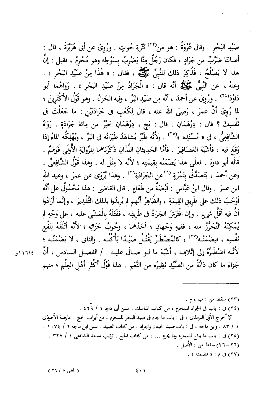 (٢٤) فى: باب فى الجراد للمحرم، من كتاب المناسك. سنن أبى داود ١/ ٤٢٩.
