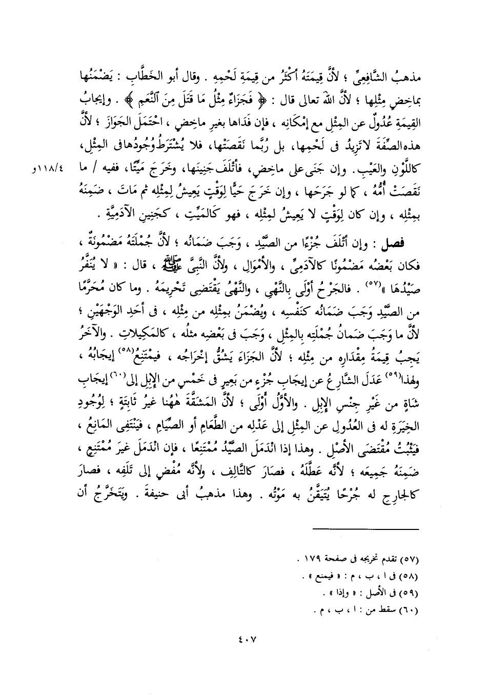 فصل: وإن أتْلَفَ جُزْءًا من الصَّيْدِ، وَجَبَ ضَمَانُه؛ لأنَّ جُمْلَتَهُ مَضْمُونَةٌ، فكان بَعْضُه مَضْمُونًا كالآدَمِىِّ، والأمْوَالِ، ولأنَّ النَّبِىَّ -صَلَّى اللهُ عَلَيْهِ وَسَلَّمَ-، قال: "لا يُنَفَّرُ صَيْدُهَا" (٥٧). فالجَرْحُ أوْلَى بِالنَّهْىِ، والنَّهْىُ يَقْتَضِى تَحْرِيمَهُ. وما كان مُحَرَّمًا من الصَّيْدِ وَجَبَ ضَمَانُه كنَفْسِه، ويُضْمَنُ بمِثْلِه من مِثْلِه، فى أحَدِ الوَجْهَيْنِ؛ لأنَّ ما وَجَبَ ضَمانُ جُمْلَتِه بِالمِثْلِ، وَجَبَ فى بَعْضِه مثلُه، كالمَكِيلاتِ. والآخَرُ يَجِبُ قِيمَةُ مِقْدَارِه من مِثْلِه؛ لأنَّ الجَزَاءَ يَشُقُّ إخْرَاجُه، فيمْتَنِعُ (٥٨) إيجَابُهُ، ولهذا (٥٩) عَدَلَ الشَّارِعُ عن إيجَابِ جُزْءٍ من بَعِيرٍ فى خَمسٍ من الإِبِلِ إلى (٦٠) إيجَابِ شَاةٍ من غَيْرِ جِنْسِ الإِبِلِ. والأوَّلُ أَوْلَى؛ لأنَّ المَشَقَّةَ هاهُنا غيرُ ثَابِتَةٍ؛ لِوُجُودِ الخِيَرَةِ له فى العُدُولِ عن المِثْلِ إلى عَدْلِه من الطَّعَامِ أو الصِّيَامِ، فيَنْتَفِى المَانِعُ، فيَثْبُتُ مُقْتَضَى الأصْلِ. وهذا إذا انْدَمَلَ الصَّيْدُ مُمْتَنِعًا، فإن انْدَمَلَ غيرَ مُمْتَنِعٍ، ضَمِنَهُ جَمِيعَه؛ لأنَّه عَطَّلَهُ، فصَارَ كالتَّالِفِ، ولأنَّه مُفْضٍ إلى تَلَفِه، فصارَ كالجارِحِ له جُرْحًا يُتَيَقَّنُ به مَوْتُه. وهذا مذهبُ أبى حنيفةَ. ويَتَخَرَّجُ أن