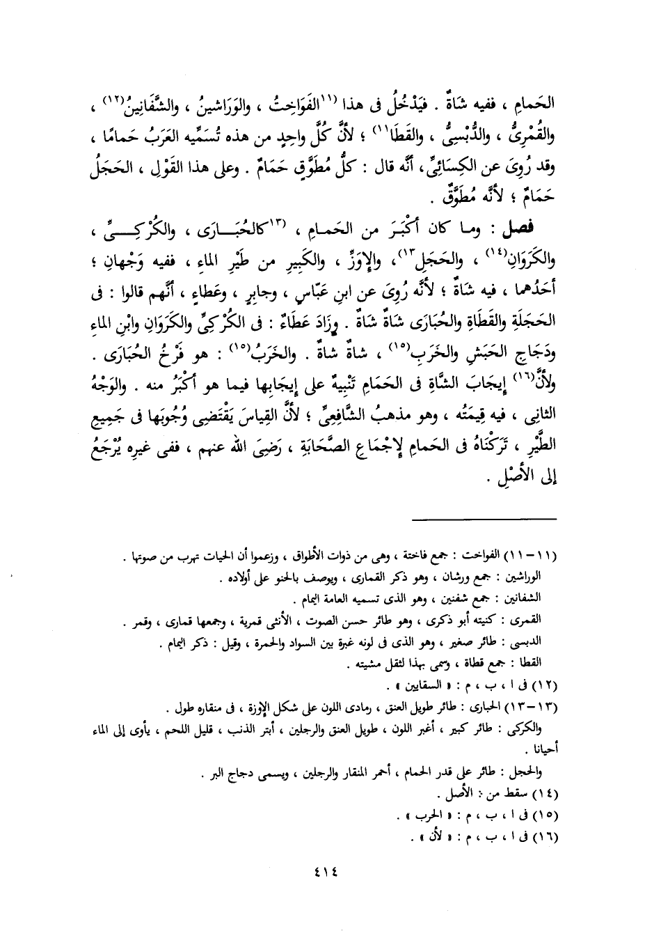 الحَمامِ، ففيه شَاةٌ. فيَدْخُلُ في هذا [الفَوَاخِتُ، والوَرَاشينُ، والشَّفَانِينُ (١١)، والقُمْرِىُّ، والدُّبْسِيُّ، والقَطَا] (١٢)؛ لأنَّ كُلَّ واحِدٍ من هذه تُسَمِّيه العَرَبُ حَمامًا، وقد رُوِىَ عن الكِسَائِيِّ، أنَّه قال: كلُّ مُطَوَّقٍ حَمَامٌ. وعلى هذا القَوْلِ، الحَجَلُ حَمَامٌ؛ لأنَّه مُطَوَّقٌ.