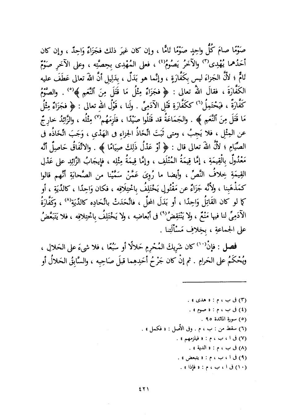 صَوْمًا صامَ كُلُّ واحِدٍ صَوْمًا تَامًّا، وإن كان غيرَ ذلك فجَزَاءٌ وَاحِدٌ، وإن كان أحَدُهما يُهْدِى (٣) والآخَرُ يَصُومُ (٤)، فعلى المُهْدِى بِحِصَّتِه، وعلى الآخَرِ صَوْمٌ تَامٌّ؛ لأنَّ الجَزاءَ ليس بِكَفَّارَةٍ، وإنَّما هو بَدَلٌ، بِدَلِيلِ أنَّ اللهَ تعالى عَطَفَ عليه الكَفَّارةَ، فقالَ اللهُ تعالى: {فَجَزَاءٌ مِثْلُ مَا قَتَلَ مِنَ النَّعَمِ} (٥). والصَّوْمُ كَفَّارَةٌ، فيَحْتَمِلُ (٦) ككَفَّارَةِ قَتْلِ الآدَمِىِّ. ولَنا، قَوْلُ اللهِ تعالى: {فَجَزَاءٌ مِثْلُ مَا قَتَلَ مِنَ النَّعَمِ}. والجَمَاعَةُ قد قَتَلُوا صَيْدًا، فلَزِمَهُم (٧) مِثْلُه، والزَّائِدُ خارِجٌ عن المِثْلِ، فلا يَجِبُ، ومتى ثَبَتَ اتِّخَاذُ الجزاءِ في الهَدْىِ، وَجَبَ اتِّخَاذُه في الصِّيَامِ؛ لأنَّ اللهَ تعالى قال: {أَوْ عَدْلُ ذَلِكَ صِيَامًا}. والاتِّفَاقُ حَاصِلٌ أنَّه مَعْدُولٌ بِالْقِيمَةِ، إمَّا قِيمَةُ المُتْلَفِ، وإمَّا قِيمَةُ مِثْلِه، فإِيجَابُ الزَّائِدِ على عَدْلِ القِيمَةِ خِلافُ النَّصِّ، وأيضا ما رُوِىَ عَمَّنْ سَمَّيْنا من الصَّحابَةِ أنَّهم قالوا كمَذْهَبِنا، ولأنَّه جَزَاءٌ عن مَقْتُولٍ يَخْتَلِفُ بِاخْتِلَافِه، فكان وَاحِدًا، كالدِّيَةِ، أو كما لو كان القَاتِلُ وَاحِدًا، أو بَدَلَ المحلِّ، فاتَّحَدَتْ باتِّحَادِه كالدِّيَةِ (٨)، وكَفَّارَةُ الآدَمِيِّ لنا فيها مَنْعٌ، ولا يَنْتَقِضُ (٩) في أبْعاضِه، ولا يَخْتَلِفُ بِاخْتِلافِه، فلا يَتَبَعَّضُ على الجماعةِ، بِخِلافِ مَسْألَتِنا.