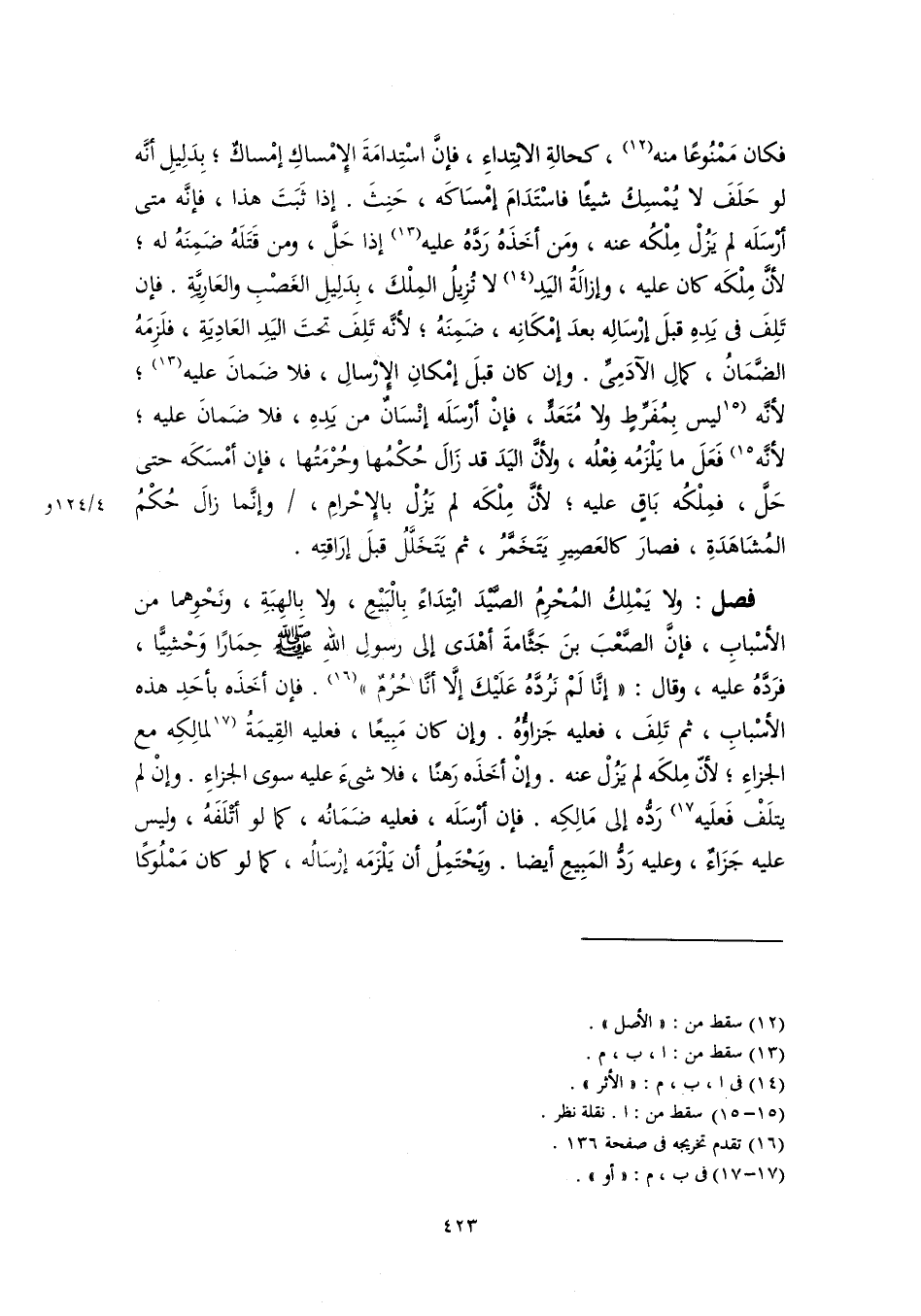فكان مَمْنُوعًا منه (١٢)، كحالةِ الابْتِداءِ، فإنَّ اسْتِدامَةَ الإِمْساكِ إمْساكٌ؛ بِدَلِيلِ أنَّه لو حَلَفَ لا يُمْسِكُ شيئًا فاسْتَدَامَ إمْسَاكَه، حَنِثَ. إذا ثَبَتَ هذا، فإنَّه متى أرْسَلَه لم يَزُلْ مِلْكُه عنه، ومَن أخَذَهُ رَدَّهُ عليه (١٣) إذا حَلَّ، ومن قَتَلَهُ ضَمِنَهُ له؛ لأنَّ مِلْكَه كان عليه، وإزالَةُ اليَدِ (١٤) لا تُزِيلُ المِلْكَ، بِدَلِيلِ الغَصْبِ والعَارِيَّةِ. فإن تَلِفَ في يَدِهِ قبلَ إرْسَالِه بعدَ إمْكَانِه، ضَمِنَهُ؛ لأنَّه تَلِفَ تحتَ اليَدِ العَادِيَةِ، فلَزِمَهُ الضَّمَانُ، كمالِ الآدَمِىِّ. وإن كان قبلَ إمْكانِ الإِرْسالِ، فلا ضَمانَ عليه (١٣)؛ لأنَّه [ليس بِمُفَرِّطٍ ولا مُتَعَدٍّ فإنْ أرْسَلَه إنْسَانٌ من يَدِهِ، فلا ضَمانَ عليه؛ لأّنَّه] (١٥) فَعَلَ ما يَلْزَمُه فِعْلُه، ولأنَّ اليَدَ قد زَالَ حُكْمُها وحُرْمَتُها، فإن أمْسَكَه حتى حَلَّ، فمِلْكُه بَاقٍ عليه؛ لأنَّ مِلْكَه لم يَزُلْ بالإِحْرامِ، وإنَّما زالَ حُكْمُ المُشَاهَدَةِ، فصارَ كالعَصِيرِ يَتَخَمَّرُ، ثم يَتَخَلَّلُ قبلَ إرَاقتِه.