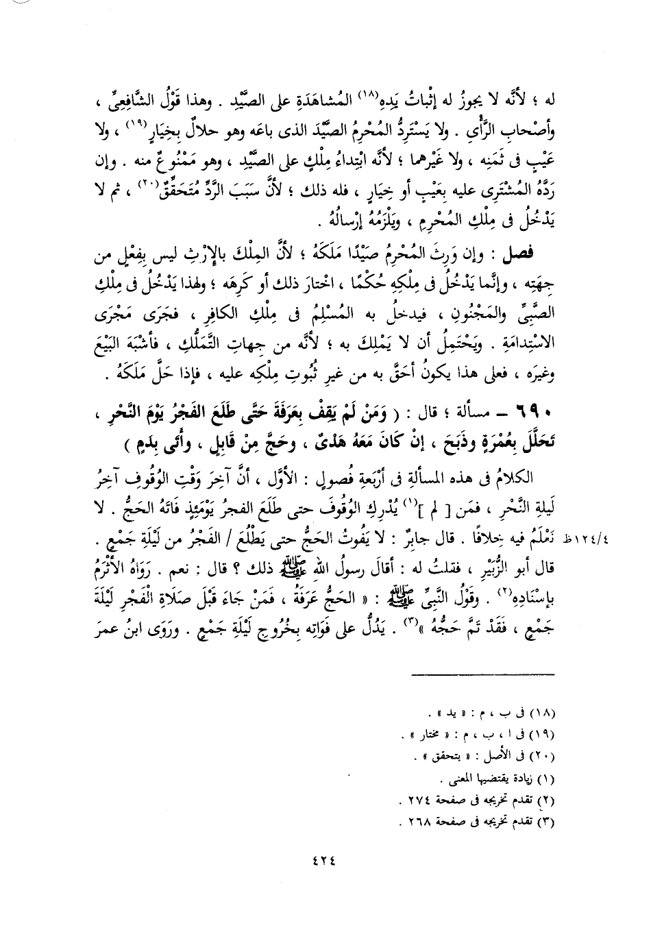 له؛ لأنَّه لا يجوزُ له إثْباتُ يَدِهِ (١٨) المُشاهَدَةِ على الصَّيْدِ. وهذا قَوْلُ الشَّافِعِىِّ، وأصْحابِ الرَّأْىِ. ولا يَسْتَرِدُّ المُحْرِمُ الصَّيْدَ الذى باعَه وهو حلالٌ بِخِيَارٍ (١٩)، ولا عَيْبٍ فى ثَمَنِه، ولا غَيْرهما؛ لأنَّه ابْتِداءُ مِلْكٍ على الصَّيْدِ، وهو مَمْنُوعٌ منه. وإن رَدَّهُ المُشْتَرِى عليه بِعَيْبٍ أو خِيَارٍ، فله ذلك؛ لأنَّ سَبَبَ الرَّدِّ مُتَحَقِّقٌ (٢٠)، ثم لا يَدْخُلُ فى مِلْكِ المُحْرِمِ، ويَلْزَمُهُ إرْسالُهُ.