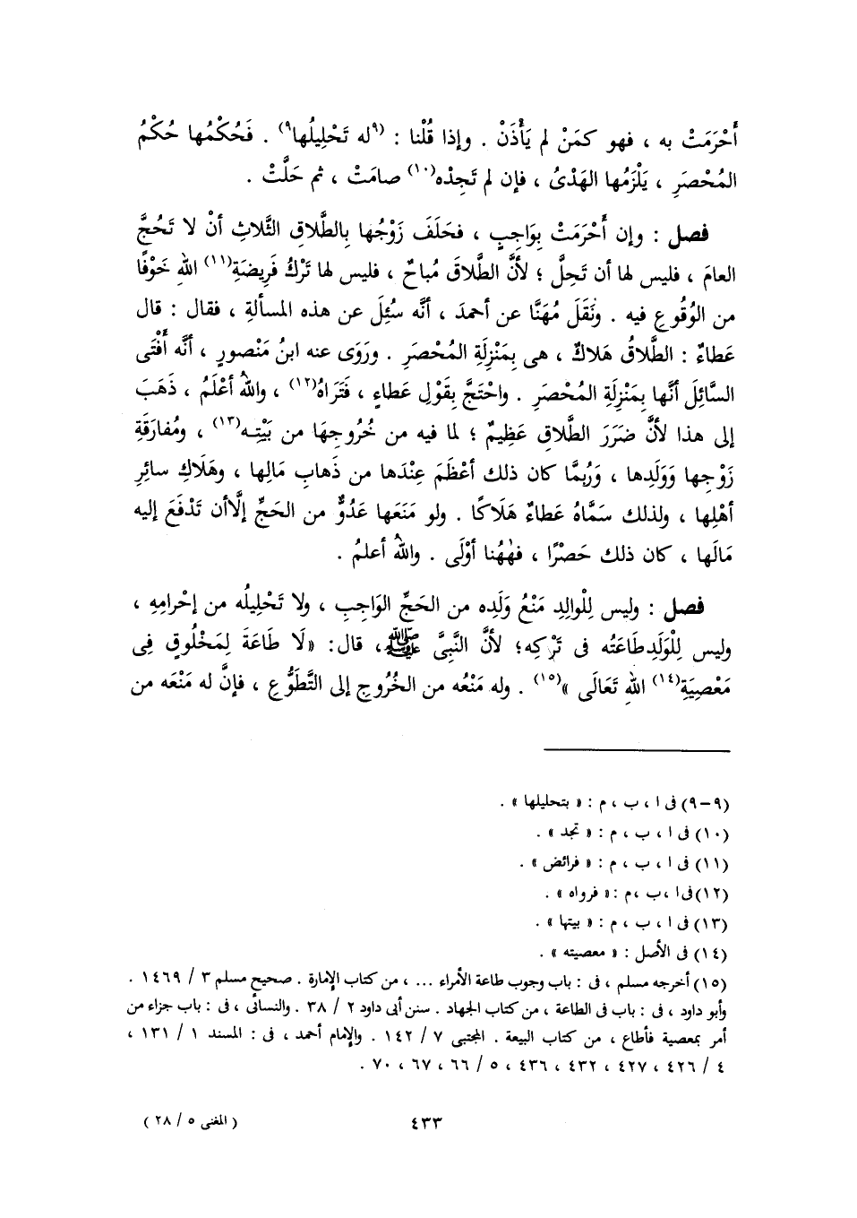 فصل: وإن أَحْرَمَتْ بِوَاجِبٍ، فحَلَفَ زَوْجُها بِالطَّلاقِ الثَّلاثِ أنْ لا تَحُجَّ العامَ، فليس لها أن تَحِلَّ؛ لأَنَّ الطَّلاقَ مُباحٌ، فليس لها تَرْكُ فَرِيضَةِ (١١) اللهِ خَوْفًا من الوُقُوعِ فيه. ونَقَلَ مُهَنَّا عن أحمدَ، أنَّه سُئِلَ عن هذه المسألةِ، فقال: قال عَطاءٌ: الطَّلاقُ هَلاكٌ، هى بِمَنْزِلَةِ المُحْصَرِ. رَوَى عنه ابنُ مَنْصورٍ، أنَّه أَفْتَى السَّائِلَ أنَّها بِمَنْزِلَةِ المُحْصَرِ. واحْتَجَّ بِقَوْلِ عَطاءٍ، فَتَرَاهُ (١٢)، واللهُ أعْلَمُ، ذَهَبَ إلى هذا لأنَّ ضَرَرَ الطَّلاقِ عَظِيمٌ؛ لما فيه من خُرُوجِهَا من بَيْتِه (١٣)، ومُفارَقَةِ زَوْجِها وَوَلَدِها، وَرُبمَّا كان ذلك أعْظَمَ عِنْدَها من ذَهابِ مَالِها، وهَلَاكِ سائِرِ أهْلِها، ولذلك سَمَّاهُ عَطاءٌ هَلَاكًا. ولو مَنَعَها عَدُوٌّ من الحَجِّ إلَّا أن تَدْفَعَ إليه مَالَها، كان ذلك حَصْرًا، فهاهُنا أوْلَى. واللهُ أعلمُ.