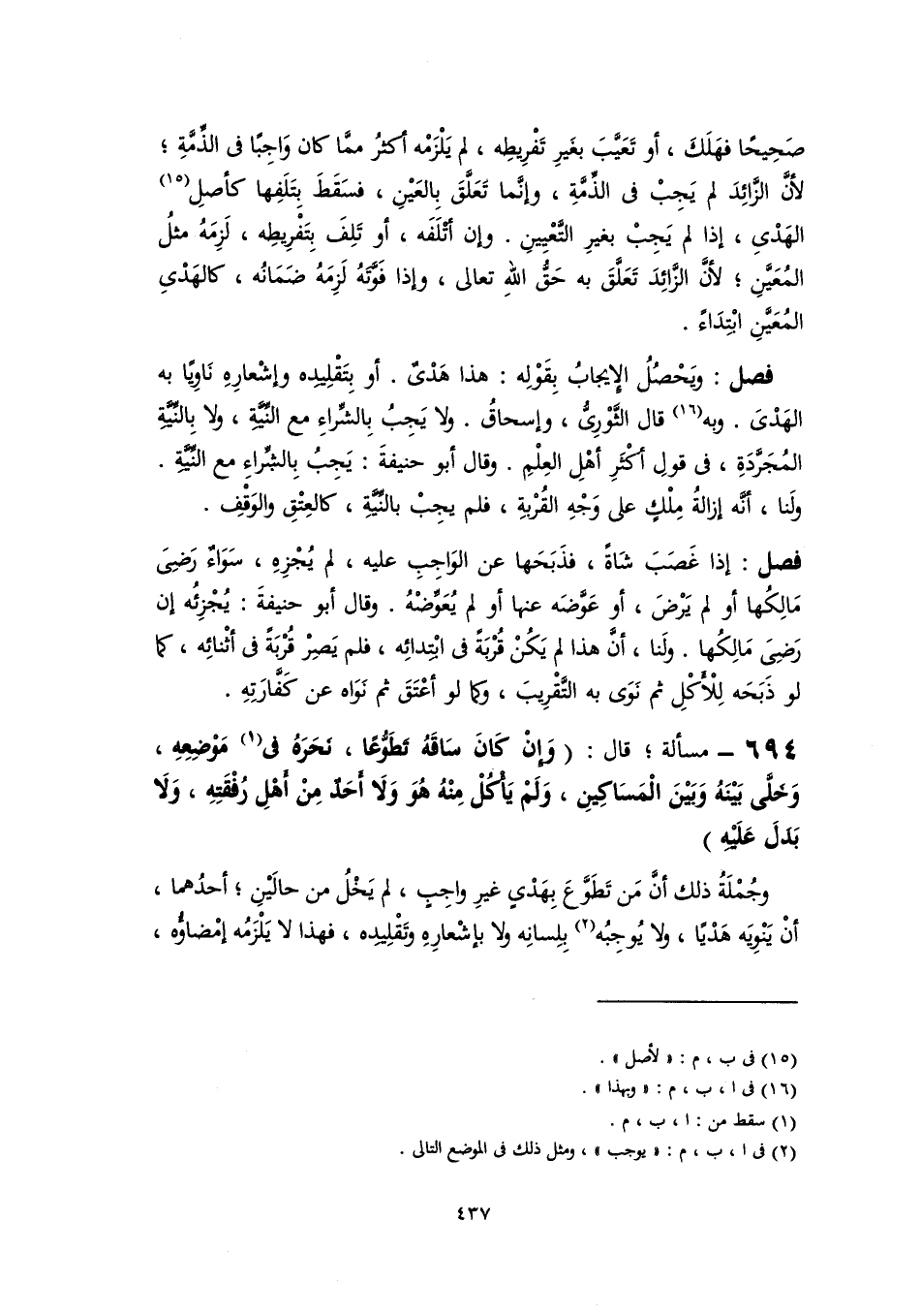 فصل: ويَحْصُلُ الإيجابُ بِقَوْلِه: هذا هَدْىٌ. أو بِتَقْلِيدِه وإشْعارِهِ نَاوِيًا به الهَدْىَ. وبه (١٦) قال الثَّوْرِيُّ، وإسحاقُ. ولا يَجِبُ بِالشِّراءِ مع النِّيَّةِ، ولا بِالنِّيَّةِ المُجَرَّدَةِ، فى قولِ أكْثَرِ أهْلِ العِلْمِ. وقال أبو حنيفةَ: يَجِبُ بِالشِّراءِ مع النِّيَّةِ. ولَنا، أنَّه إزالةُ مِلْكٍ على وَجْهِ القُرْبةِ، فلم يجِبْ بالنِّيَّةِ، كالعِتْقِ والوَقْفِ.