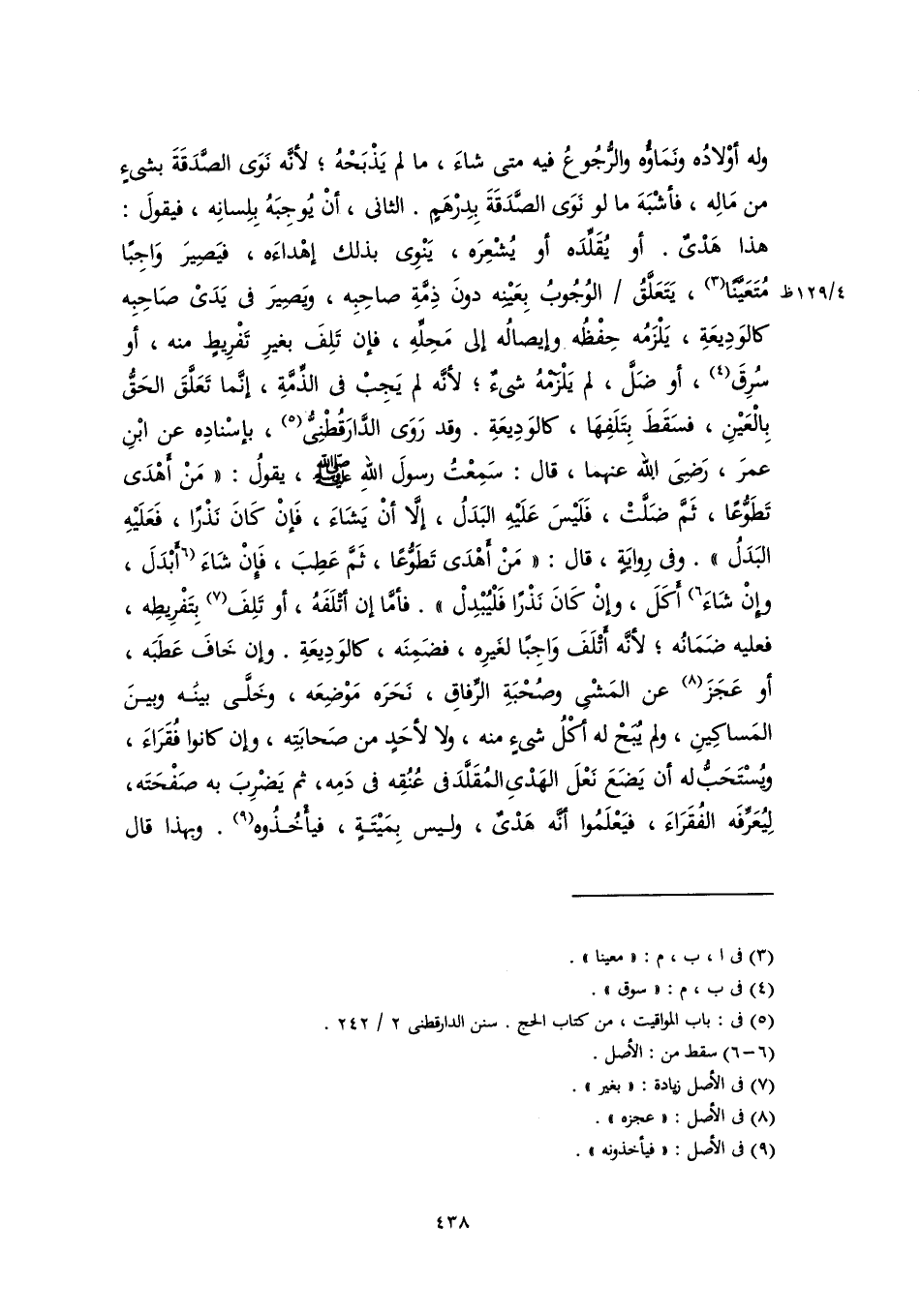 وله أوْلادُه ونَمَاؤُه والرُّجُوعُ فيه متى شاءَ، ما لم يَذْبَحْهُ؛ لأنَّه نَوَى الصَّدَقَةَ بشىءٍ من مَالِه، فأشْبَهَ ما لو نَوَى الصَّدَقَةَ بِدِرْهَمٍ. الثانى، أنْ يُوجِبَهُ بِلِسانِه، فيقولَ: هذا هَدْىٌ. أو يُقَلِّدَه أو يُشْعِرَه، يَنْوِى بذلك إهْداءَه، فيَصِيرَ وَاجِبًا مُتَعَيَّنًا (٣)، يَتَعَلَّقُ الوُجُوبُ بِعَيْنِه دونَ ذِمَّةِ صاحِبِه، ويَصِيرَ فى يَدَىْ صَاحِبِه كالوَدِيعَةِ، يَلْزَمُه حِفْظُه وإيصالُه إلى مَحِلِّهِ، فإن تَلِفَ بغيرِ تَفْرِيطٍ منه، أو سُرِقَ (٤)، أو ضَلَّ، لم يَلْزَمْهُ شىءٌ؛ لأنَّه لم يَجِبْ فى الذِّمَّةِ، إنَّما تَعَلَّقَ الحَقُّ بِالْعَيْنِ، فسَقَطَ بِتَلَفِهَا، كالوَدِيعَةِ. وقد رَوَى الدَّارَقُطْنِىُّ (٥)، بإسْنادِه عن ابْنِ عمرَ، رَضِىَ اللَّه عنهما، قال: سَمِعْتُ رسولَ اللهِ -صَلَّى اللهُ عَلَيْهِ وَسَلَّمَ-، يقولُ: "مَنْ أهْدَى تَطَوُّعًا، ثَمَّ ضَلَّتْ، فَلَيْسَ عَلَيْهِ البَدَلُ، إلَّا أنْ يَشَاءَ، فَإنْ كَانَ نَذْرًا، فَعَلَيْهِ البَدَلُ". وفى رِوايَةٍ، قال: "مَنْ أهْدَى تَطَوُّعًا، ثَمَّ عَطِبَ، فَإنْ شَاءَ [أبْدَلَ، وإنْ شَاءَ] (٦) أكَلَ، وإنْ كَانَ نَذْرًا فَلْيُبْدِلْ". فأمَّا إن أتْلَفَهُ، أو تَلِفَ (٧) بِتَفْرِيطِه، فعليه ضَمَانُه؛ لأنَّه أَتْلَفَ وَاجِبًا لغَيرِه، فضَمِنَه، كالوَدِيعَةِ. وإن خَافَ عَطَبَه، أو عَجَزَ (٨) عن المَشْىِ وصُحْبَةِ الرِّفاقِ، نَحَرَه مَوْضِعَه، وخَلَّى بينه وبينَ المَساكِينِ، ولم يُبَحْ له أكْلُ شىءٍ منه، ولا لأحَدٍ من صَحابَتِه، وإن كانوا فُقَرَاءَ، ويُسْتَحَبُّ له أن يَضَعَ نَعْلَ الهَدْىِ المُقَلَّدَ فى عُنُقِه فى دَمِه، ثم يَضْرِبَ به صَفْحَتَه، لِيُعَرِّفَه الفُقَرَاءَ، فيَعْلَمُوا أنَّه هَدْىٌ، وليس بِمَيْتَةٍ، فيأْخُذُوه (٩). وبهذا قال