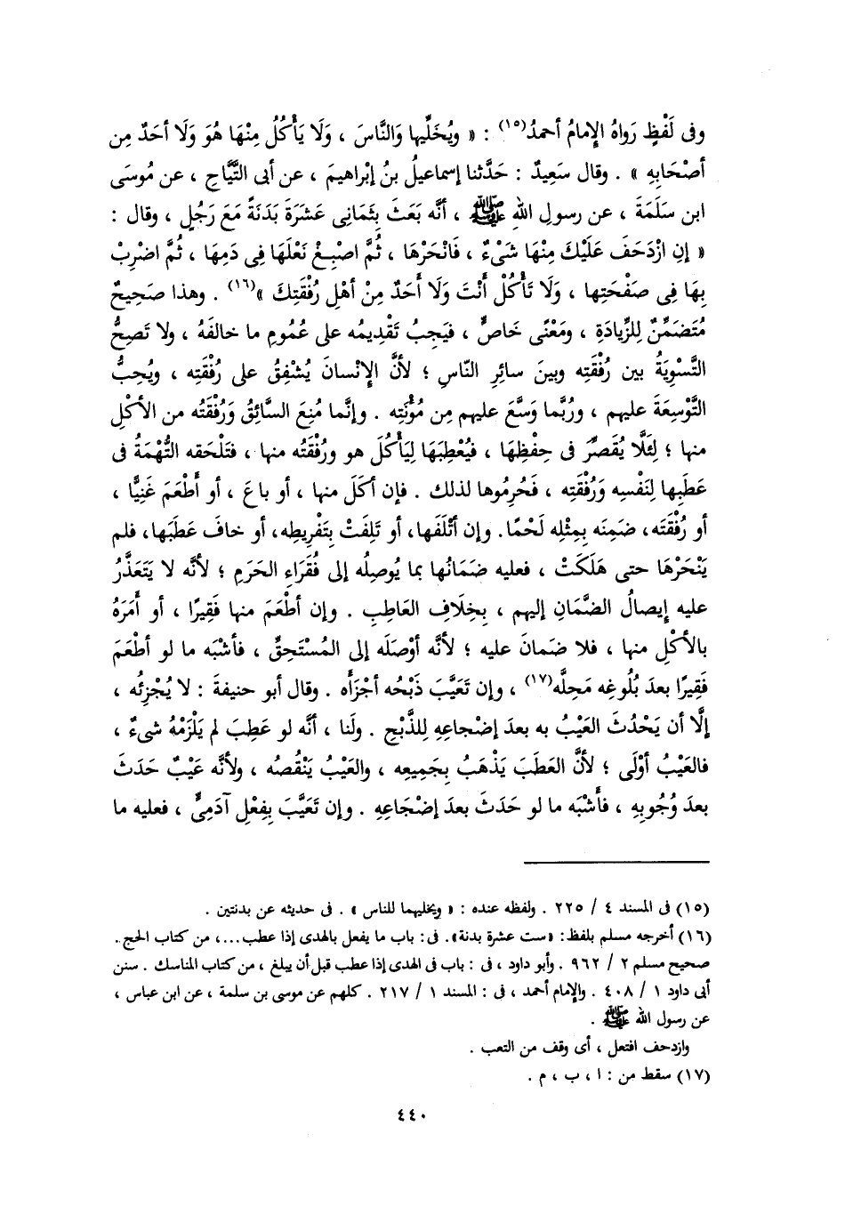 وفى لَفْظٍ رَواهُ الإمامُ أحمدُ (١٥): "ويُخَلِّيها وَالنَّاسَ، وَلَا يَأْكُلُ مِنْهَا هُوَ وَلَا أحَدٌ مِن أصْحَابِهِ". وقال سَعِيدٌ: حَدَّثنا إسماعيلُ بنُ إبْراهيمَ، عن أبى التَّيَّاحِ، عن مُوسَى ابن سَلَمَةَ، عن رسولِ اللهِ -صَلَّى اللهُ عَلَيْهِ وَسَلَّمَ-، أنَّه بَعَثَ بِثَمَانِى عَشَرَةَ بَدَنَةً مَعَ رَجُلٍ، وقال: "إنِ ازْدَحَفَ عَلَيْكَ مِنْهَا شَىْءٌ، فَانْحَرْهَا، ثُمَّ اصْبِغْ نَعْلَهَا فِى دَمِهَا، ثُمَّ اضْرِبْ بِهَا فِى صَفْحَتِها، وَلَا تَأْكُلْ أنْتَ وَلَا أحَدٌ مِنْ أهْلِ رُفْقَتِكَ" (١٦). وهذا صَحِيحٌ مُتَضَمِّنٌ لِلزِّيادَةِ، ومَعْنًى خَاصٍّ، فيَجِبُ تَقْدِيمُه على عُمُومِ ما خالفَهُ، ولا تَصِحُّ التَّسْوِيَةُ بين رُفْقَتِه وبينَ سائِرِ النّاسِ؛ لأنَّ الإنْسانَ يُشْفِقُ على رُفْقَتِه، ويُحِبُّ التَّوْسِعَةَ عليهم، ورُبَّما وَسَّعَ عليهم مِن مُؤْنَتِه. وإنَّما مُنِعَ السَّائِقُ وَرُفْقَتُه من الأكْلِ منها؛ لِئَلَّا يُقَصِّرَ فى حِفْظِهَا، فيُعْطِبَهَا لِيَأْكُلَ هو ورُفْقَتُه منها، فتَلْحَقه التُّهْمَةُ فى عَطَبِها لِنَفْسِه وَرُفْقَتِه، فَحُرِمُوها لذلك. فإن أكَلَ منها، أو باعَ، أو أَطْعَمَ غَنِيًّا، أو رُفْقَتَه، ضَمِنَه بِمِثْلِه لَحْمًا. وإن أَتْلَفَها، أو تَلِفَتْ بِتَفْرِيطِه، أو خافَ عَطَبَها، فلم يَنْحَرْهَا حتى هَلَكَتْ، فعليه ضَمَانُها بما يُوصِلُه إلى فُقَرَاءِ الحَرَمِ؛ لأنَّه لا يَتَعَذَّرُ عليه إيصالُ الضَّمَانِ إليهم، بِخِلَافِ العَاطِبِ. وإن أطْعَمَ منها فَقِيرًا، أو أَمَرَهُ بالأكْلِ منها، فلا ضَمانَ عليه؛ لأنَّه أوْصَلَه إلى المُسْتَحِقِّ، فأشْبَه ما لو أطْعَمَ فَقِيرًا بعدَ بُلُوغِه مَحِلَّه (١٧)، وإن تَعَيَّبَ ذَبْحُه أجْزَأَه. وقال أبو حنيفةَ: لا يُجْزِئُه، إلَّا أن يَحْدُثَ العَيْبُ به بعدَ إضْجاعِهِ لِلذَّبْحِ. ولَنا، أنَّه لو عَطِبَ لم يَلْزَمْهُ شىءٌ، فالعَيْبُ أوْلَى؛ لأنَّ العَطَبَ يَذْهَبُ بِجَمِيعِه، والعَيْبُ يَنْقُصُه، ولأنَّه عَيْبٌ حَدَثَ بعدَ وُجُوبِهِ، فأشْبَه ما لو حَدَثَ بعدَ إضْجَاعِهِ. وإن تَعَيَّبَ بِفِعْلِ آدَمِىٍّ، فعليه ما