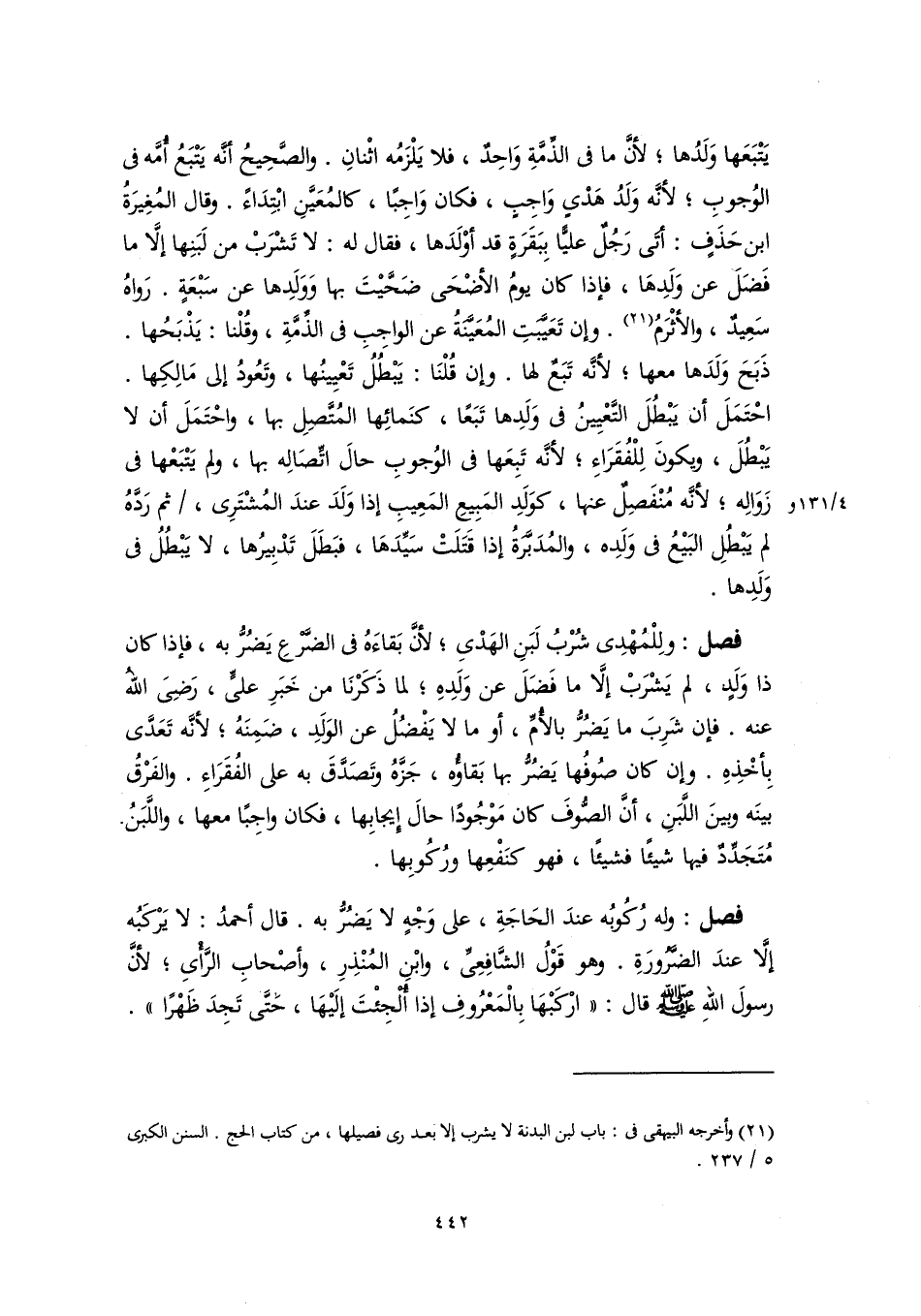 فصل: ولِلْمُهْدِى شُرْبُ لَبَنِ الهَدْىِ؛ لأنَّ بَقاءَهُ فى الضَّرْعِ يَضُرُّ به، فإذا كان ذا وَلَدٍ، لم يَشْرَبْ إلَّا ما فَضَلَ عن وَلَدِهِ، لما ذَكَرْنَا من خَبَرِ علىٍّ، رَضِىَ اللهُ عنه. فإن شَرِبَ ما يَضُرُّ بالأُمِّ، أو ما لا يَفْضُلُ عن الوَلَدِ، ضَمِنَهُ؛ لأنَّه تَعَدَّى بِأخْذِهِ. وإن كان صُوفُها يَضُرُّ بها بَقاؤُه، جَزَّهُ وتَصَدَّقَ به على الفُقَرَاءِ. والفَرْقُ بينَه وبينَ اللَّبَنِ، أنَّ الصُّوفَ كان مَوْجُودًا حالَ إيجابِها، فكان واجِبًا معها، واللَّبَنُ. مُتَجَدِّدٌ فيها شيئًا فشيئًا، فهو كنَفْعِها ورُكُوبِها.