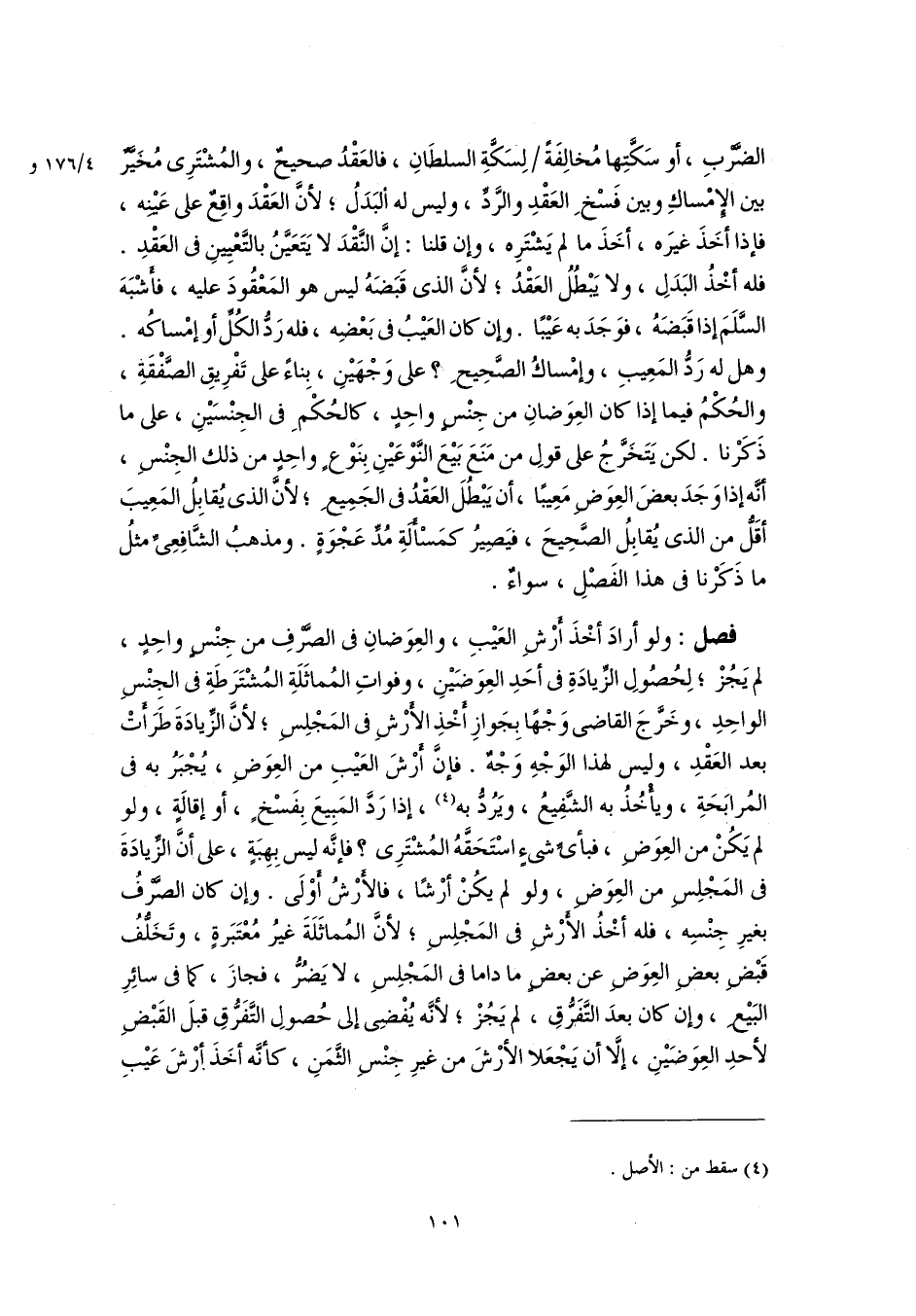 فصل: ولو أرادَ أخْذَ أَرْشِ العَيْبِ، والعِوَضانِ فى الصَّرْفِ من جِنْسٍ واحِدٍ، لم يَجُزْ؛ لِحُصُولِ الزِّيادَةِ فى أحَدِ العِوَضَيْنِ، وفواتِ المُماثَلَةِ المُشْتَرَطَةِ فى الجِنْسِ الواحِدِ، وخَرَّجَ القاضى وَجْهًا بِجَوازِ أَخْذِ الأَرْشِ فى المَجْلِسِ؛ لأنَّ الزِّيادَةَ طَرَأَتْ بعد العَقْدِ، وليس لهذا الوَجْهِ وَجْهٌ. فإنَّ أَرْشَ العَيْبِ من العِوَضِ، يُجْبَرُ به فى المُرابَحَةِ، ويأْخُذُ به الشَّفِيعُ، ويَرُدُّ به (٤)، إذا رَدَّ المَبِيعَ بِفَسْخٍ، أو إقالَةٍ، ولو لم يَكُنْ من العِوَضِ، فبأىِّ شىءٍ اسْتَحَقَّهُ المُشْتَرِى؟ فإنَّه ليس بِهِبَةٍ، على أنَّ الزِّيادَةَ فى المَجْلِسِ من العِوَضِ، ولو لم يكُنْ أرْشًا، فالأَرْشُ أَوْلَى. وإن كان الصَّرْفُ بغيرِ جِنْسِه، فله أخْذُ الأَرْشِ فى المَجْلِسِ؛ لأنَّ المُماثَلَةَ غيرُ مُعْتَبَرةٍ، وتَخَلُّفُ قَبْضِ بعضِ العِوَضِ عن بعضٍ ما داما فى المَجْلِسِ، لا يَضُرُّ، فجازَ، كما فى سائِرِ البَيْعِ، وإن كان بعدَ التَّفَرُّقِ، لم يَجُزْ؛ لأنَّه يُفْضِى إلى حُصولِ التَّفَرُّقِ قبلَ القَبْضِ لأحدِ العِوَضَيْنِ، إلَّا أن يَجْعَلا الأرْشَ من غيرِ جِنْسِ الثَّمَنِ، كأنَّه أخَذَ أرْشَ عَيْبِ