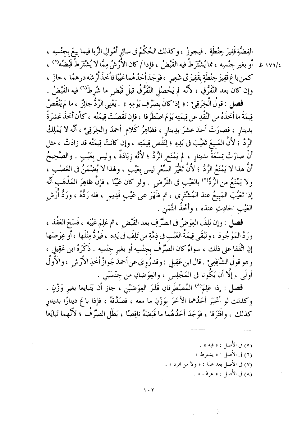 فصل: قولُ الْخِرَقِىِّ: "إذا كانَ بِصَرْفِ يَوْمِهِ". يَعْنِى الرَّدُّ جائِزٌ، ما لم يَنْقُصْ قِيمَةَ ما أخَذَهُ من النَّقْدِ عن قِيمَتِه يَوْمَ اصْطَرَفا، فإن نَقَصَتْ قِيمَتُه، كأن أخَذَ عَشرَةً بدينارٍ، فصارَتْ أحدَ عشرَ بدِينارٍ، فظاهِرُ كَلامِ أحمدَ والخِرَقِىِّ، أنَّه لا يَمْلِكُ الرَّدَّ؛ لأنَّ المَبِيعَ تَعَيَّبَ فى يَدِهِ؛ لِنَقْص قِيمَتِه، وإنَ كانَتْ قِيمَتُه قد زادَتْ، مثل أنْ صارَتْ تِسْعَةً بدينارٍ، لم يَمْنَعِ الرَّدَّ؛ لأنَّه زِيَادَةٌ، وليس بِعَيْبٍ. والصَّحِيحُ أنَّ هذا لا يَمْنَعُ الرَّدَّ؛ لأنَّ تَغَيُّرَ السِّعْرِ ليس بِعَيْبٍ، ولهذا لا يُضْمَنُ فى الغَصْبِ، ولا يَمْنَعُ من الرَّدِّ (٧) بالعَيْبِ فى القَرْضِ. ولو كان عَيْبًا، فإنَّ ظاهِرَ المَذْهَبِ أنَّه إذا تَعَيَّبَ المَبِيعُ عندَ المُشْتَرِى، ثم ظَهَرَ على عَيْبٍ قَدِيمٍ، فله رَدُّهُ، ورَدُّ أَرْشِ العَيْبِ الحادِثِ عندَه، وأخْذُ الثَّمَنِ.