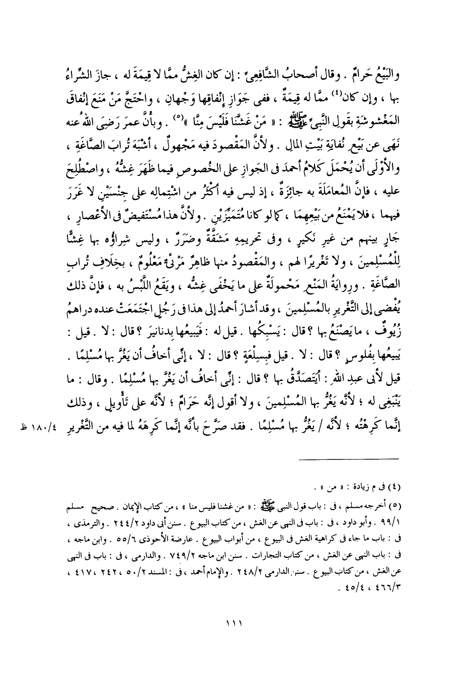 (٥) أخرجه مسلم، فى: باب قول النبى -صَلَّى اللهُ عَلَيْهِ وَسَلَّمَ-: "من غشنا فليس منا"، من كتاب الإيمان. صحيح مسلم ١/ ٩٩. وأبو داود، فى: باب فى النهى عن الغش، من كتاب البيوع. سنن أبى داود ٢/ ٢٤٤. والترمذى، فى: باب ما جاء فى كراهية الغش فى البيوع، من أبواب البيوع. عارضة الأحوذى ٦/ ٥٥. وابن ماجه، فى: باب النهى عن الغش، من كتاب التجارات. سنن ابن ماجه ٢/ ٧٤٩. والدارمى، فى: باب فى النهى عن الغش، من كتات البيوع. سنن الدارمى ٢/ ٢٤٨. والإمام أحمد، فى: المسند ٢/ ٥٠، ٢٤٢، ٤١٧، ٣/ ٤٦٦، ٤/ ٤٥.