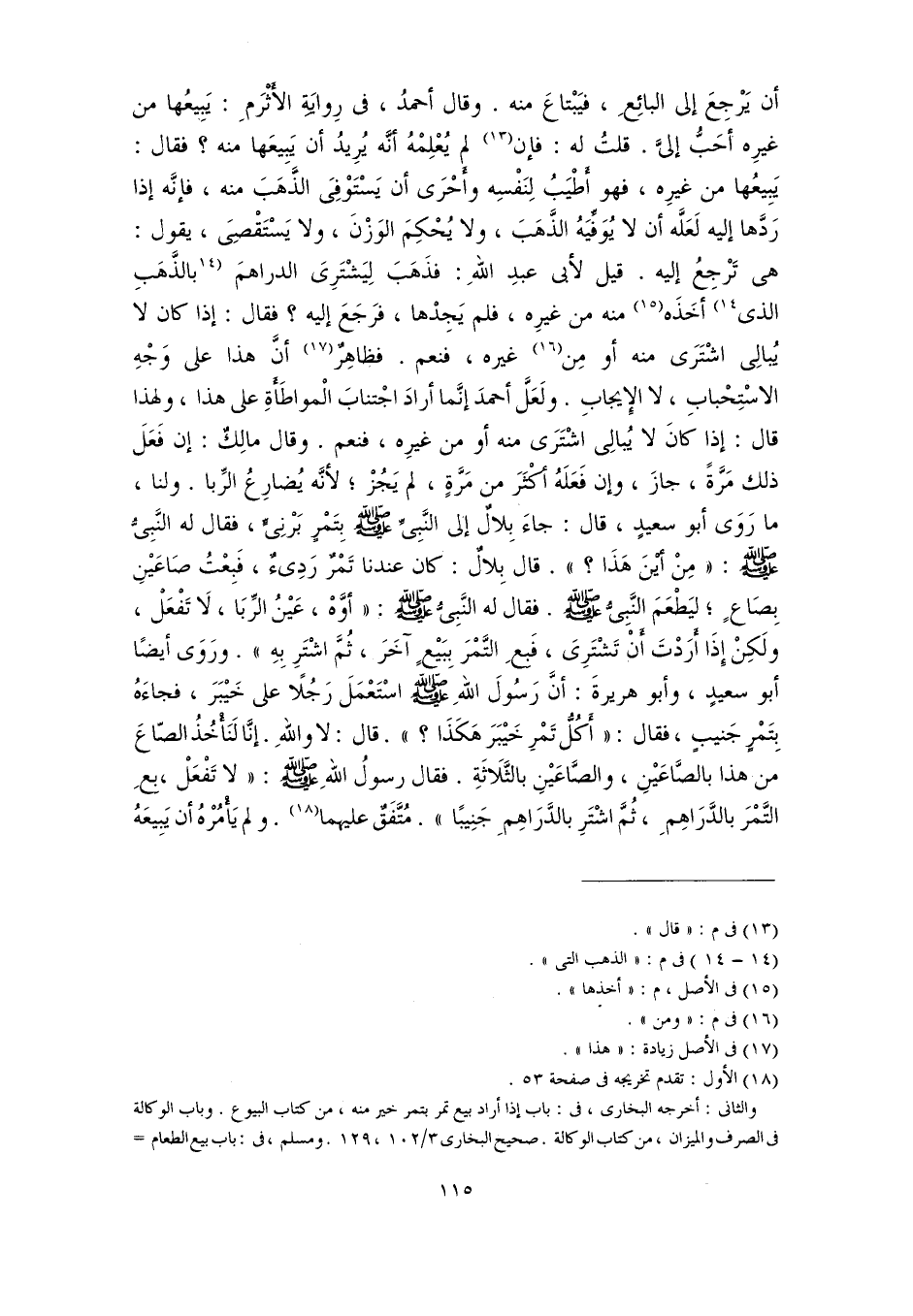 أن يَرْجِعَ إلى البائِعِ، فيَبْتاعَ منه. وقال أحمدُ، فى رِوايَةِ الأَثْرَمِ: يَبِيعُها من غيرِه أحَبُّ إلىَّ. قلتُ له: فإن (١٣) لم يُعْلِمْهُ أنَّه يُرِيدُ أن يَبِيعَها منه؟ فقال: يَبِيعُها من غيرِه، فهو أَطْيَبُ لِنَفْسِه وأَحْرَى أن يَسْتَوْفِىَ الذَّهَبَ منه، فإنَّه إذا رَدَّها إليه لَعَلَّه أن لا يُوَفِّيَهُ الذَّهَبَ، ولا يُحْكِمَ الوَزْنَ، ولا يَسْتَقْصِىَ، يقول: هى تَرْجِعُ إليه. قيل لأبى عبدِ اللهِ: فذَهَبَ لِيَشْتَرِىَ الدراهمَ [بالذَّهَبِ الذى] (١٤) أخَذَه (١٥) منه من غيرِه، فلم يَجِدْها، فرَجَعَ إليه؟ فقال: إذا كان لا يُبالِى اشْتَرَى منه أو مِن (١٦) غيره، فنعم. فظاهِرٌ (١٧) أنَّ هذا على وَجْهِ الاسْتِحْبابِ، لا الإِيجابِ. ولَعَلَّ أحمدَ إنَّما أرادَ اجْتنابَ الْمواطَأَةِ على هذا، ولهذا قال: إذا كانَ لا يُبالِى اشْتَرَى منه أو من غيرِه، فنعم. وقال مالِكٌ: إن فَعَلَ ذلك مَرَّةً، جازَ، وإن فَعَلَهُ أكْثَرَ من مَرَّةٍ، لم يَجُزْ؛ لأنَّه يُضارِعُ الرِّبا. ولنا، ما رَوَى أبو سعيدٍ، قال: جاءَ بِلالٌ إلى النَّبِىِّ -صَلَّى اللهُ عَلَيْهِ وَسَلَّمَ- بِتَمْرٍ بَرْنِىٍّ، فقال له النَّبِىُّ -صَلَّى اللهُ عَلَيْهِ وَسَلَّمَ-: "مِنْ أيْنَ هَذَا؟ ". قال بِلالٌ: كان عندنا تَمْرٌ رَدِىءٌ، فَبِعْتُ صَاعَيْنِ بِصَاعٍ؛ ليَطْعَمَ النَّبِىُّ -صَلَّى اللهُ عَلَيْهِ وَسَلَّمَ-. فقال له النَّبِىُّ -صَلَّى اللهُ عَلَيْهِ وَسَلَّمَ-: "أوَّهْ، عَيْنُ الرِّبَا، لَا تَفْعَل، ولَكِنْ إِذَا أرَدْتَ أَنْ تَشْتَرِىَ، فَبِعِ التَّمْرَ بِبَيْعٍ آخَرَ، ثُمَّ اشْتَرِ بِهِ". ورَوَى أيضًا أبو سعيدٍ، وأبو هريرةَ: أنَّ رَسُولَ اللهِ -صَلَّى اللهُ عَلَيْهِ وَسَلَّمَ- اسْتَعْمَلَ رَجُلًا على خَيْبَرَ، فجاءَهُ بِتَمْرٍ جَنيبٍ، فقال: "أَكُلُّ تَمْرِ خَيْبَرَ هَكَذَا؟ ". قال: لا واللهِ. إنَّا لَنَأْخُذُ الصّاعَ من هذا بالصَّاعَيْنِ، والصَّاعَيْنِ بالثَّلَاثَةِ. فقال رسولُ اللهِ -صَلَّى اللهُ عَلَيْهِ وَسَلَّمَ-: "لا تَفْعَلْ، بِعِ التَّمْرَ بالدَّرَاهِمِ، ثُمَّ اشْتَرِ بالدَّرَاهِمِ جَنِيبًا". مُتَّفَقٌ عليهما (١٨). ولم يَأْمُرْهُ أن يَبِيعَهُ