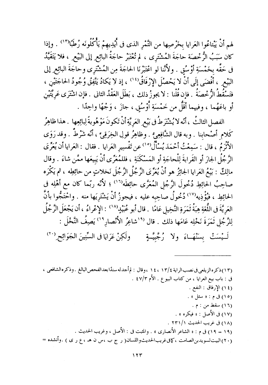 الفصل الثالثُ، أنّه لا يُشْتَرَطُ في بَيْعِ العَرِيَّةِ أنْ تَكونَ مَوْهُوبةً لِبائِعِها. هذا ظاهِرُ كَلامِ أصْحابِنا. وبه قال الشَّافِعِيُّ. وظاهِرُ قولِ الخِرَقِيِّ، أنّه شَرْطٌ. وقد رَوَى الأثْرَمُ، قال: سَمِعْتُ أحْمَدَ يُسْأَلُ (١٥) عن تَفْسِيرِ العَرايا. فقال: العَرايا أن يُعَرِّىَ الرَّجُلُ الجارَ أو القَرابةَ لِلْحاجَةِ أو المَسْكَنَةِ، فللمُعَرِّى أنْ يَبِيعَها ممَّن شاءَ. وقال مالِكٌ: بَيْعُ العَرايا الجائِزُ هو أنْ يُعَرِّىَ الرَّجُلُ الرَّجُلَ نَخلاتٍ من حائِطِه، ثم يَكْرَه صاحِبُ الحائِطِ دُخُولَ الرَّجُلِ المُعَرَّى حائِطَه (١٦)؛ لأنّه ربّما كان مع أهْلِه في الحائِطِ، فيُؤْذِيه (١٧) دُخُولُ صاحِبِه عليه، فيجوزُ أنْ يَشْتَرِيَها منه. واحْتَجُّوا بأنَّ العَرِيَّةَ في اللُّغَةِ هِبَةُ ثَمَرَةِ النَّخِيلِ عَامًا. قال أبو عُبَيْدٍ (١٨): الإِعْراءُ، أن يَجْعَلَ الرَّجُلُ لِلرَّجُلِ ثَمَرَةَ نَخْلِه عَامَها ذلك. قال [شاعِرُ الأنْصارِ] (١٩) يَصِفُ النَّخْلَ: