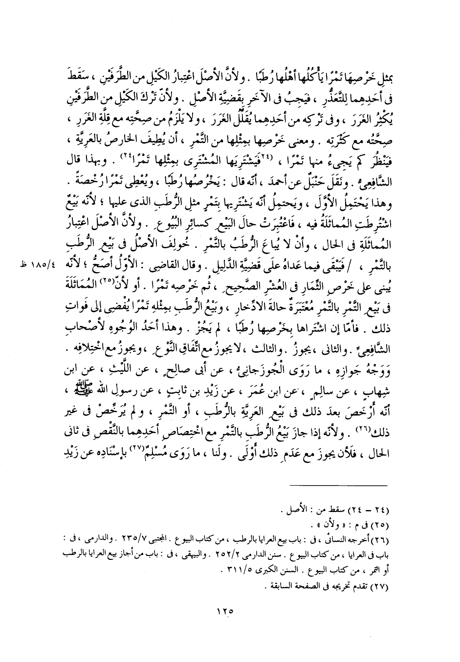 بمثلِ خَرْصِهَا تَمْرًا يَأْكُلُها أهْلُها رُطَبًا. ولأنَّ الأصْلَ اعْتِبارُ الكَيْلِ من الطَّرَفَيْنِ، سَقَطَ في أحَدِهِما لِلتَّعَذُّرِ، فيَجِبُ في الآخَرِ بِقَضِيَّةِ الأصْلِ. ولأنّ تَرْكَ الكَيْلِ من الطَّرَفَيْنِ يُكْثِرُ الغَرَرَ، وفى تَرْكِه من أحَدِهِما يُقَلِّلُ الغَرَرَ، ولا يَلْزَمُ من صِحَّتِه مع قِلَّةِ الغَرَرِ، صِحَّتُه مع كَثْرَتِه. ومعنى خَرْصِها بمِثْلِها من التَّمْرِ، أن يُطِيفَ الخارصُ بالعَرِيَّةِ، فيَنْظُرَ كم يَجِىءُ منها تَمْرًا، [فَيَشْتَرِيَها المُشْتَرِى بمِثْلِها تَمْرًا] (٢٤). وبهذا قال الشَّافِعِيُّ. ونَقَلَ حَنْبَلٌ عن أحمدَ، أنّه قال: يَخْرُصُها رُطَبًا، ويُعْطِى تَمْرًا رُخْصَةً. وهذا يَحْتَمِلُ الأوَّلَ، ويَحتمِلُ أنّه يَشْتَرِيها بِتَمْرٍ مثلِ الرُّطَبِ الذى عليها؛ لأنّه بَيْعٌ اشْتُرِطَتِ المُماثَلَةُ فيه، فَاعْتُبِرَتْ حالَ البَيْعِ كسائِرِ البُيُوعِ. ولأنَّ الأصْلَ اعْتِبارُ المُماثَلَةِ في الحال، وأنْ لا يُباعَ الرُّطَبُ بالتَّمْرِ. خُولِفَ الأصْلُ في بَيْعِ الرُّطَبِ بالتَّمْرِ، فَيَبْقَى فيما عَداهُ علَى قَضِيَّةِ الدَّلِيلِ. وقال القاضِى: الأوّلُ أصَحُّ؛ لأنّه يُبنى على خَرْصِ الثِّمَارِ في العُشْرِ الصَّحِيحِ، ثُم خَرْصِه تَمْرًا. أو لأنّ (٢٥) المُمَاثَلَةَ في بَيْعِ التَّمْرِ بالتَّمْرِ مُعْتَبَرَةٌ حالةَ الادِّخارِ، وبَيْعُ الرُّطَبِ بمِثْلهِ تَمْرًا يُفْضِى إلى فَواتِ ذلك. فأمّا إن اشْتَراها بِخَرْصِها رُطَبًا، لم يَجُزْ. وهذا أحَدُ الوُجُوهِ لأصْحابِ الشَّافِعِيِّ. والثاني، يجوزُ. والثالث، لا يجوزُ مع اتِّفَاقِ النَّوْعِ، ويجوزُ مع اخْتِلافِه. وَوَجْهُ جَوازِهِ، ما رَوَى الْجُوزَجانِيُّ، عن أبى صالِحٍ، عن اللَّيْثِ، عن ابن شِهابٍ، عن سالِمٍ، عن ابن عُمَرَ، عن زَيْدِ بن ثابِتٍ، عن رسولِ اللَّه -صَلَّى اللهُ عَلَيْهِ وَسَلَّمَ-، أنّه أَرْخَصَ بعدَ ذلك في بَيْعِ العَرِيَّةِ بالرُّطَبِ، أو التَّمْرِ، ولم يُرَخِّصْ في غير ذلك (٢٦). ولأنّه إذا جازَ بَيْعُ الرُّطَبِ بالتَّمْرِ مع اخْتِصَاصِ أحَدِهِما بالنَّقْصِ في ثاني الحال، فلَأن يجوزَ مع عَدَمِ ذلك أَوْلَى. ولَنا، ما رَوَى مُسْلِمٌ (٢٧) بإسْنَادِه عن زَيْدِ