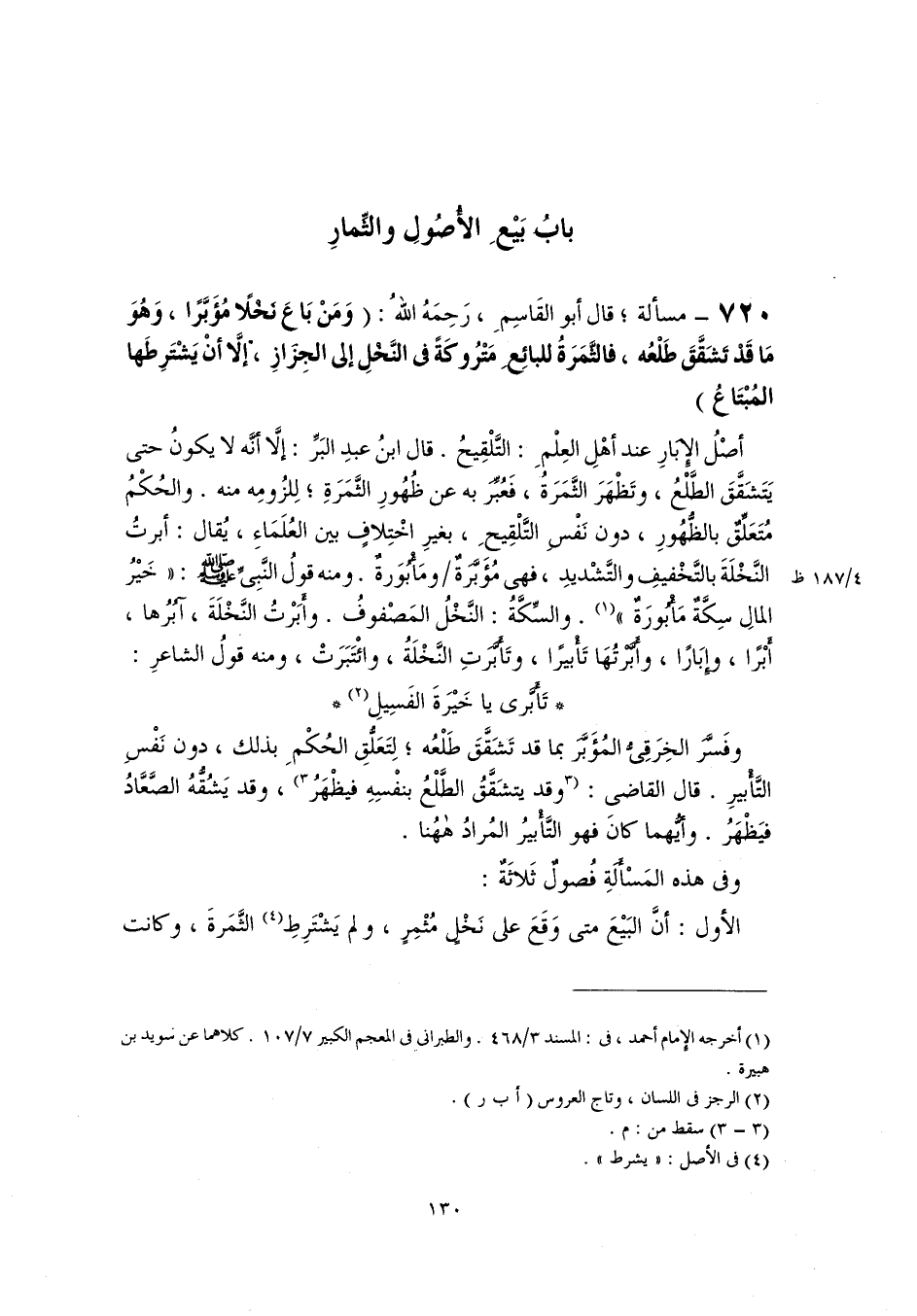 الأول: أنَّ البَيْعَ متى وَقَعَ على نَخْلٍ مُثْمِرٍ، ولم يَشْتَرِطِ (٤) الثَّمَرةَ، وكانت